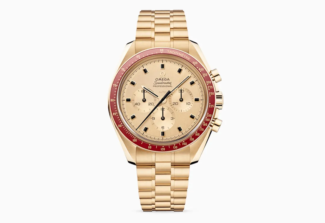 Как вы отмечаете золотую годовщину появления часов на Луне в 69 году? Конечно, вы делаете золотую версию этих часов. Они не просто из простого золота. Эти Apollo 11 50th Anniversary изготовлены из самогонного золота Omega, нового легированного металла, легче стандартного желтого золота и более устойчивого к выцветанию.