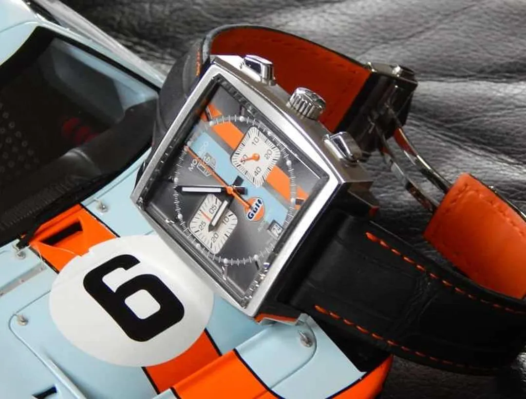 Хотя оригинальная модель Gulf 2005 года была красно-белой, вдохновленная костюмом Маккуина, в котором он выступал в Ле-Мане, именно оранжево-синяя ливрея – отсылка к спонсируемому Маккуином Porsche 917 – стала культовой. Это идеальные часы для воскресных поездок, когда вы представляете, что обгоняете Льюиса Хэмилтона на трассе Massenet.