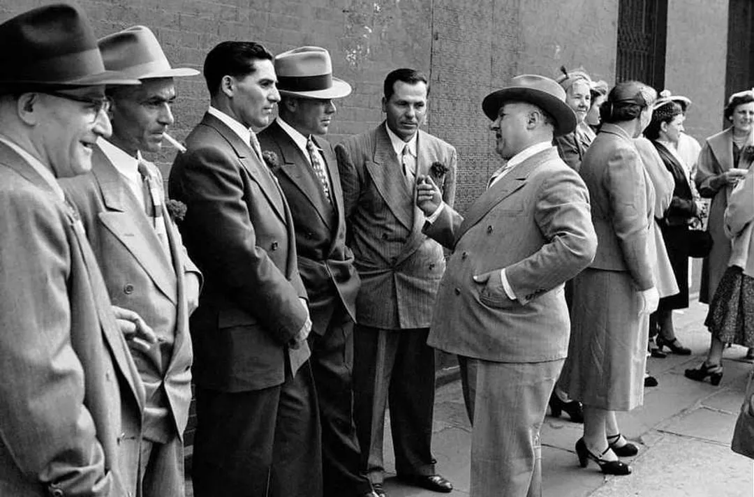 Мысль о том, что на рассвете 1950-х годов мужчина мог появиться на публике в чем угодно, только не в костюме, была невообразимой. Тщательно подобранные костюмы с зашитыми лацканами, нагрудными карманами, соответствующими брюками и широкими накладками были стандартной формой мужчин, усердно работавших над собой, чтобы снова интегрироваться в работу после окончания войны.