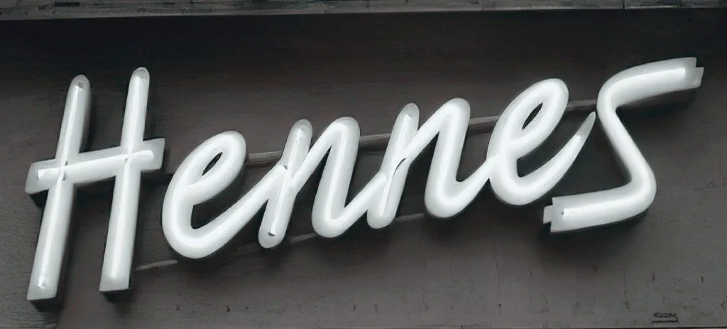 Самый ранний логотип - это просто слово «Hennes», набранное белым неоновым шрифтом на темном фоне, что позволяет предположить, что это была вывеска на фасаде магазина.
