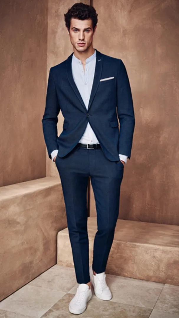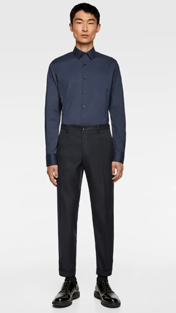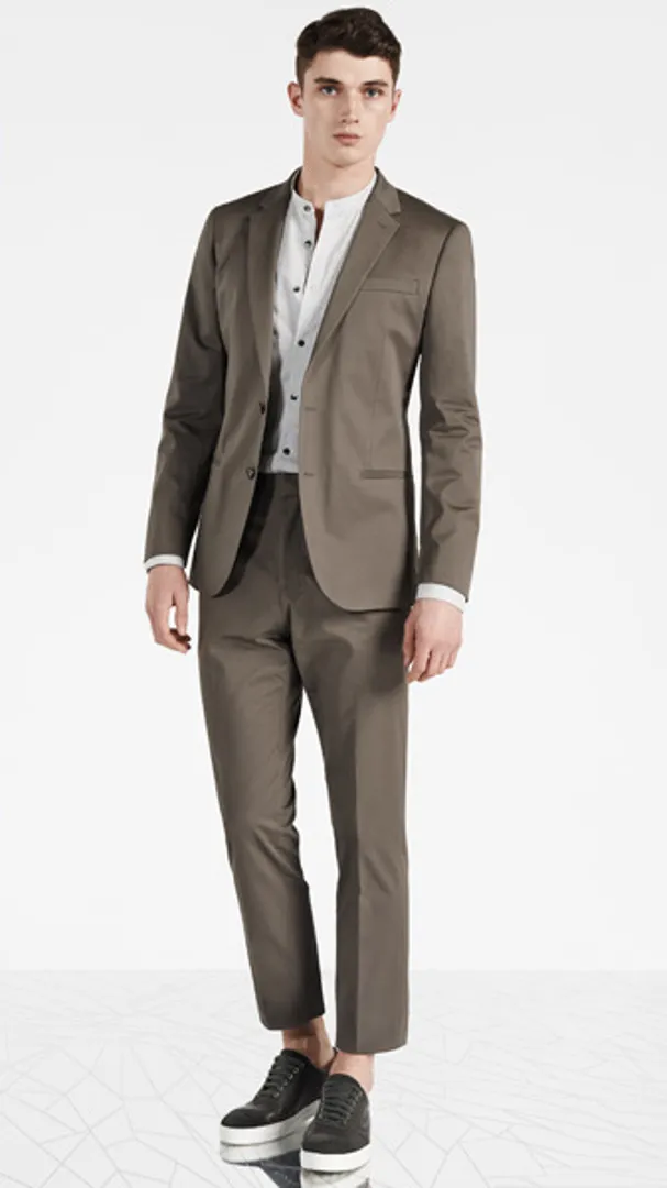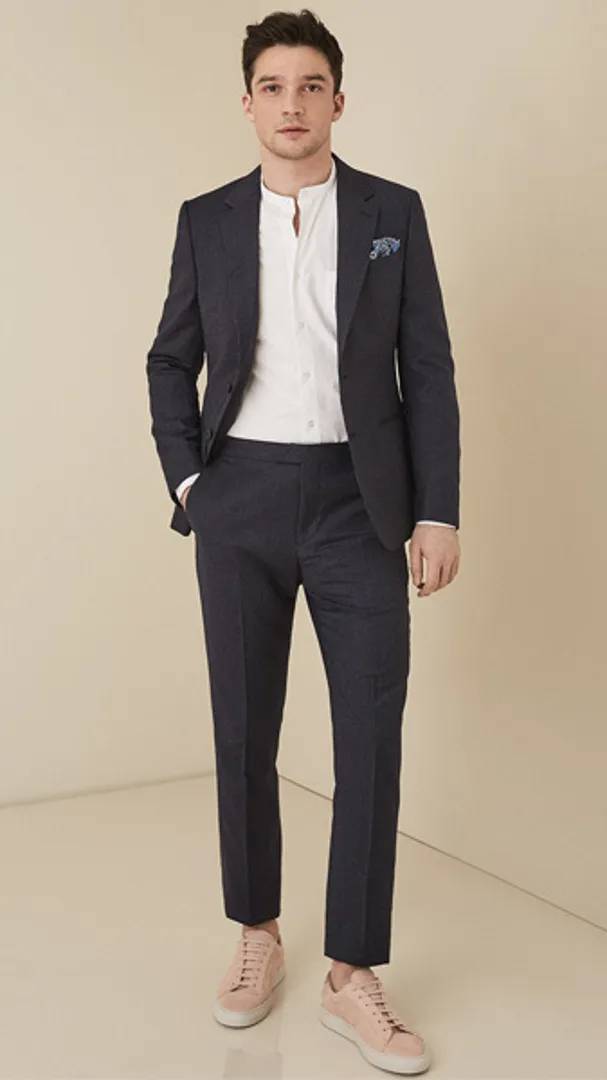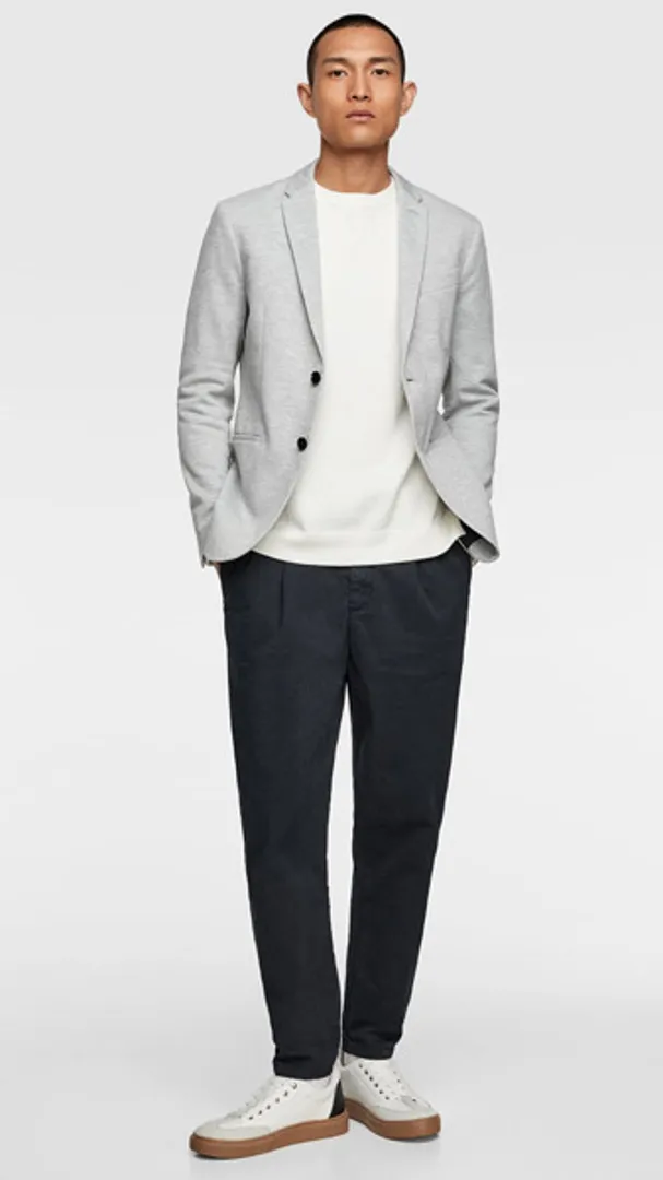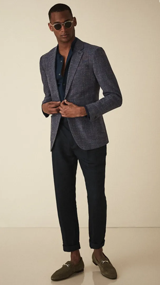 Обратите внимание на укороченные брюки, чтобы максимально задействовать повседневную деловую обувь в стиле бизнес кэжуал для мужчин (например, замшевые дерби или минималистские кроссовки), но предупредите коллег по цеху, что вы все еще остаетесь в бизнесе, расстегивая верхнюю пуговицу рубашки.