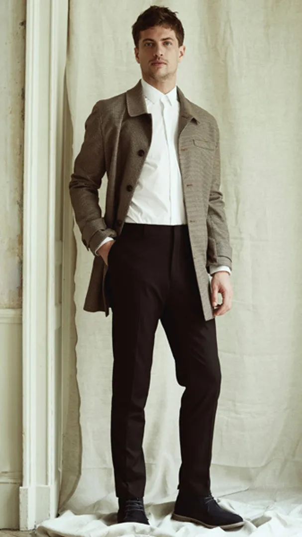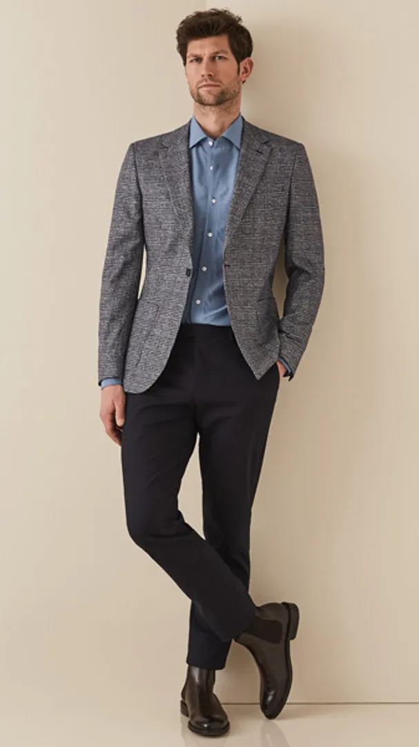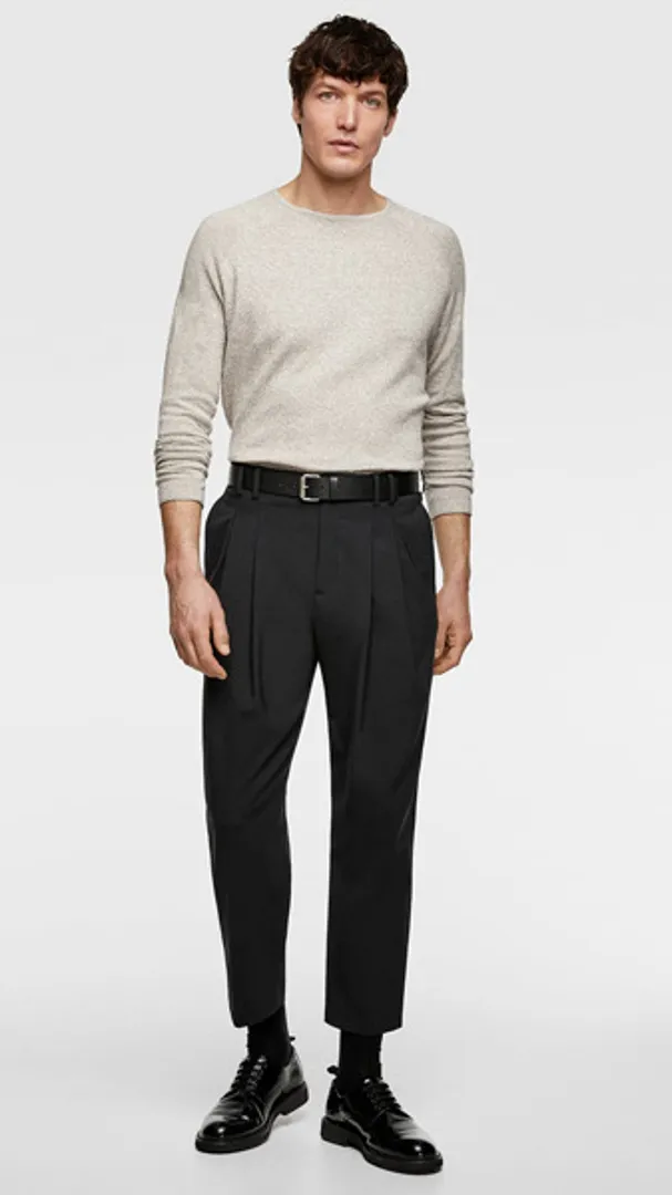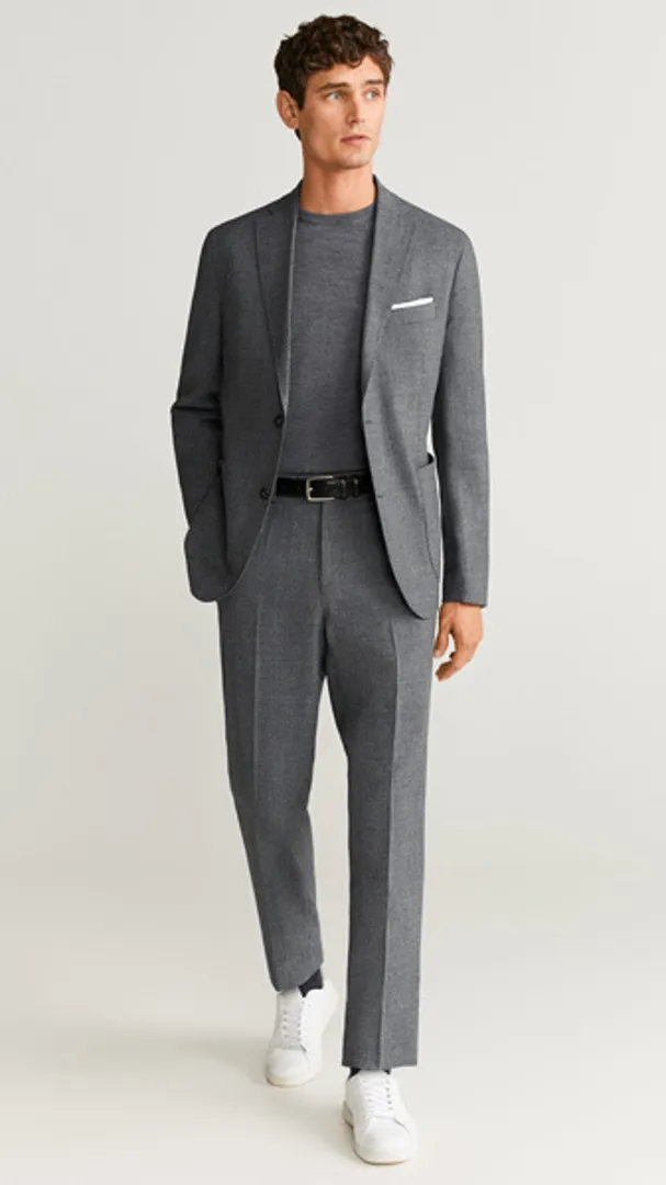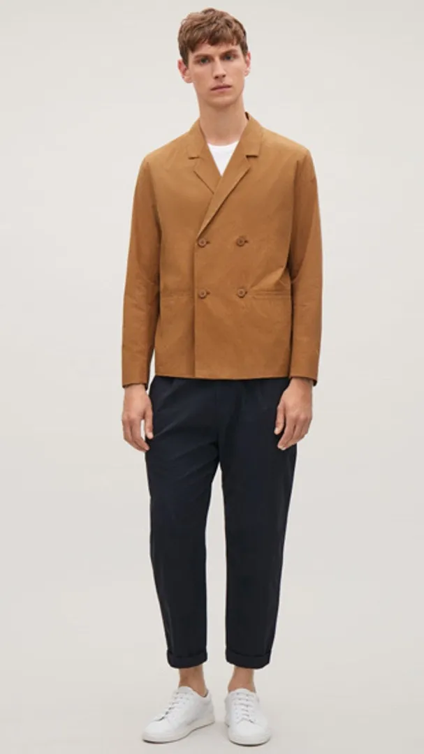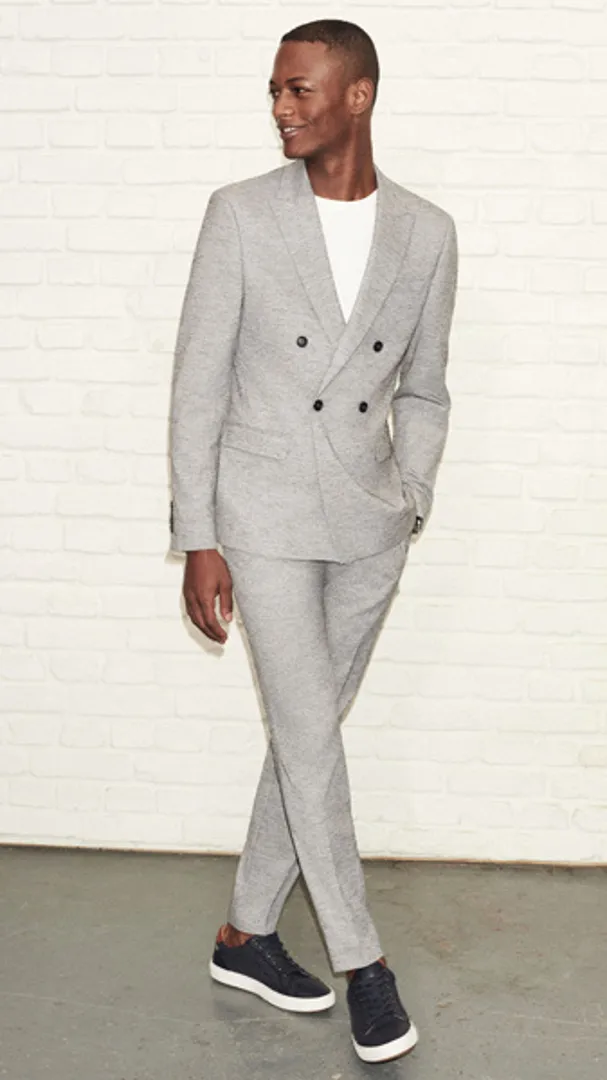 Обратите внимание на укороченные брюки, чтобы максимально задействовать повседневную деловую обувь в стиле бизнес кэжуал для мужчин (например, замшевые дерби или минималистские кроссовки), но предупредите коллег по цеху, что вы все еще остаетесь в бизнесе, расстегивая верхнюю пуговицу рубашки.