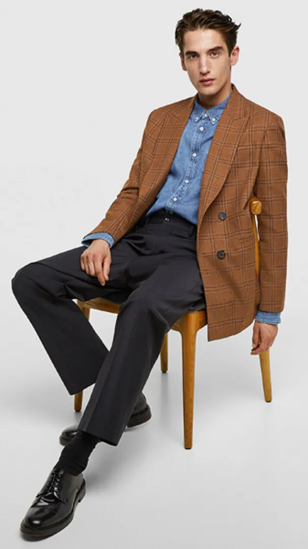 Это еще не все, что может сделать джинсовая рубашка, она также искусно подчеркивает отдельные части одежды. Если вы цените удобство и практичность, вам понравится сочетание темно-синей джинсовой рубашки и коричневого двубортного пиджака, серых классических брюк с пестрыми крапинками и черных туфель дерби.