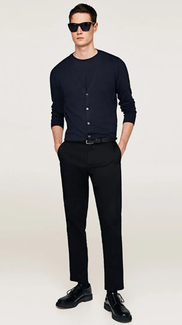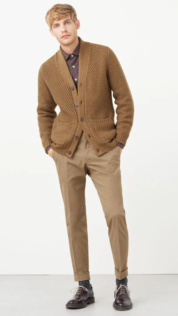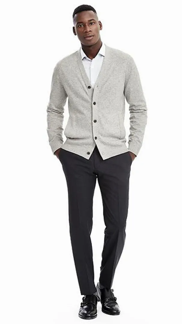 Для тех, кто настороженно относится к книжным чарам кардигана, начните с черного, темно-синего или темно-серого шерстяного дизайна, надетого на белую рубашку, темно-синий галстук, светло-серые брюки на заказ и черные туфли дерби. Те, кто более уверен в силе кардигана следует выглядеть более утонченно, подбирая его оттенок под рубашку поло или под брюки.