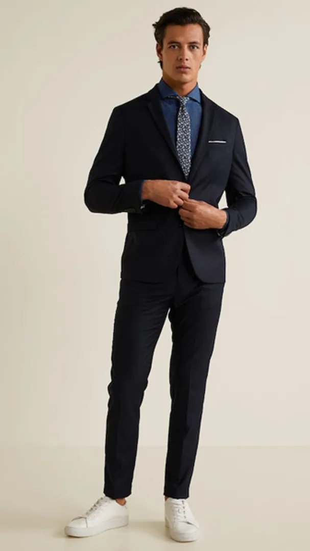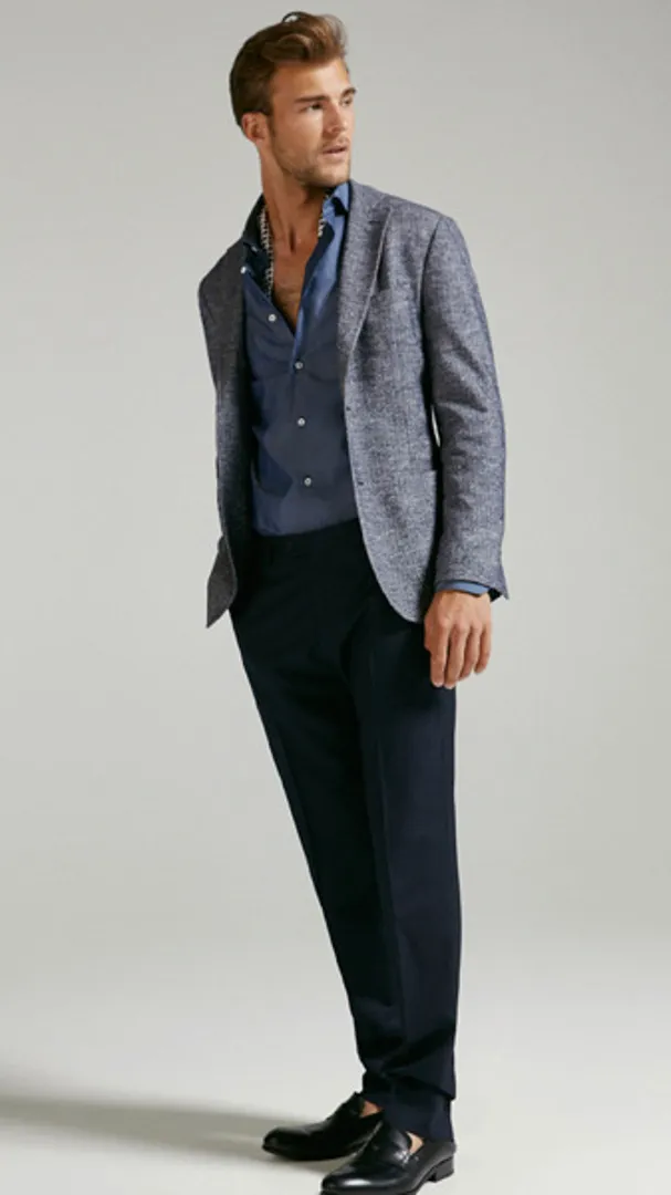 Для остальных есть множество подходящих вариантов. Летом попробуйте надеть бледно-голубой джинсовый дизайн (без галстука) под бледно-верблюжий костюм и завершить образ черными лоферами. С наступлением более прохладной погоды, выберите более темную и толстую джинсовую ткань. Скомбинируйте с бордовым вязаным галстуком, темно-синим костюмом и с теми же лоферами.