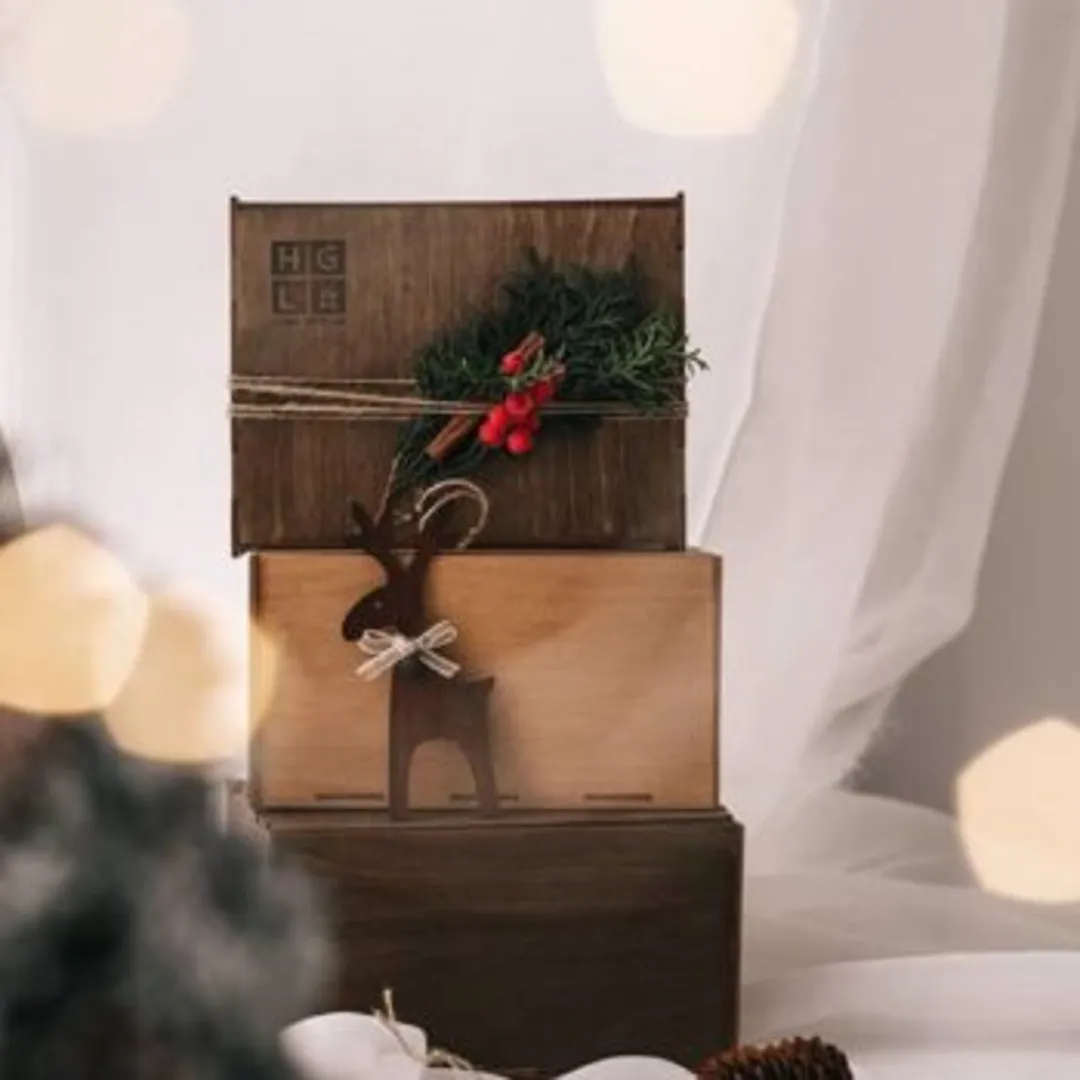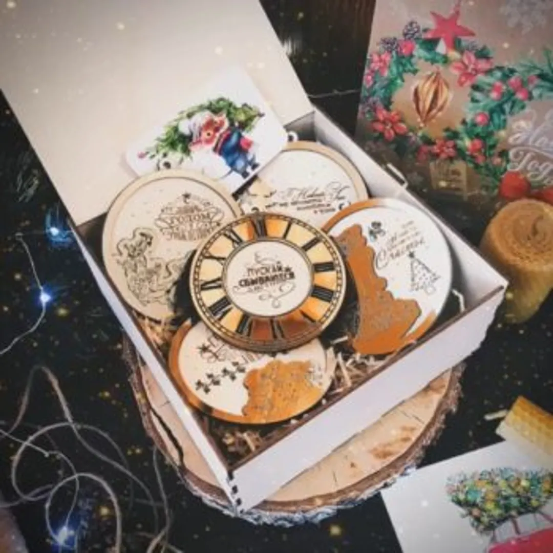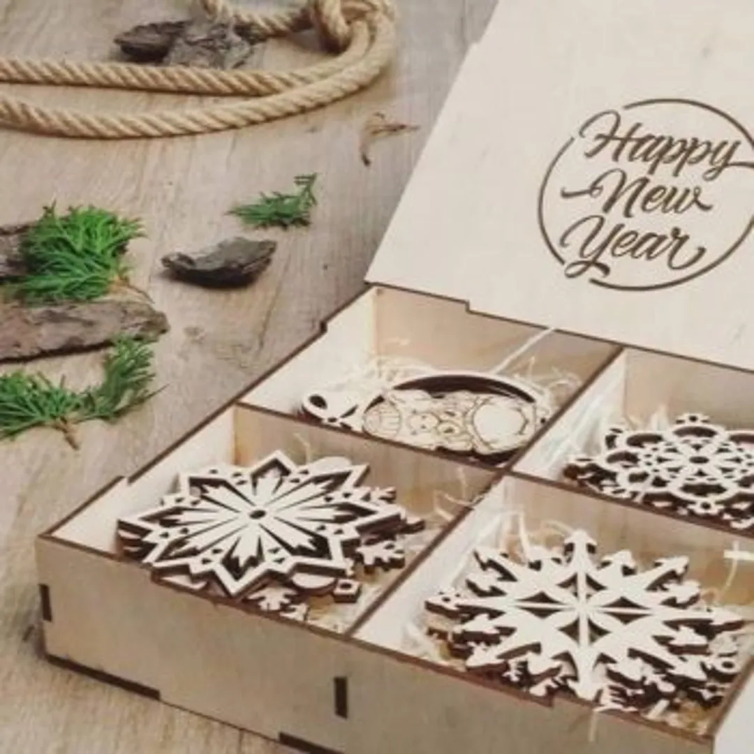 Набор елочных игрушек. Предпочтение следует отдавать игрушкам из дерева, они смотрятся стильно и современно. В качестве упаковки следует использовать небольшую заполненную предварительно подарочной стружкой коробочку, отличным декором станет еловая ветка и красная лента. Презент может быть подарен всем сотрудникам или конкретному человеку.