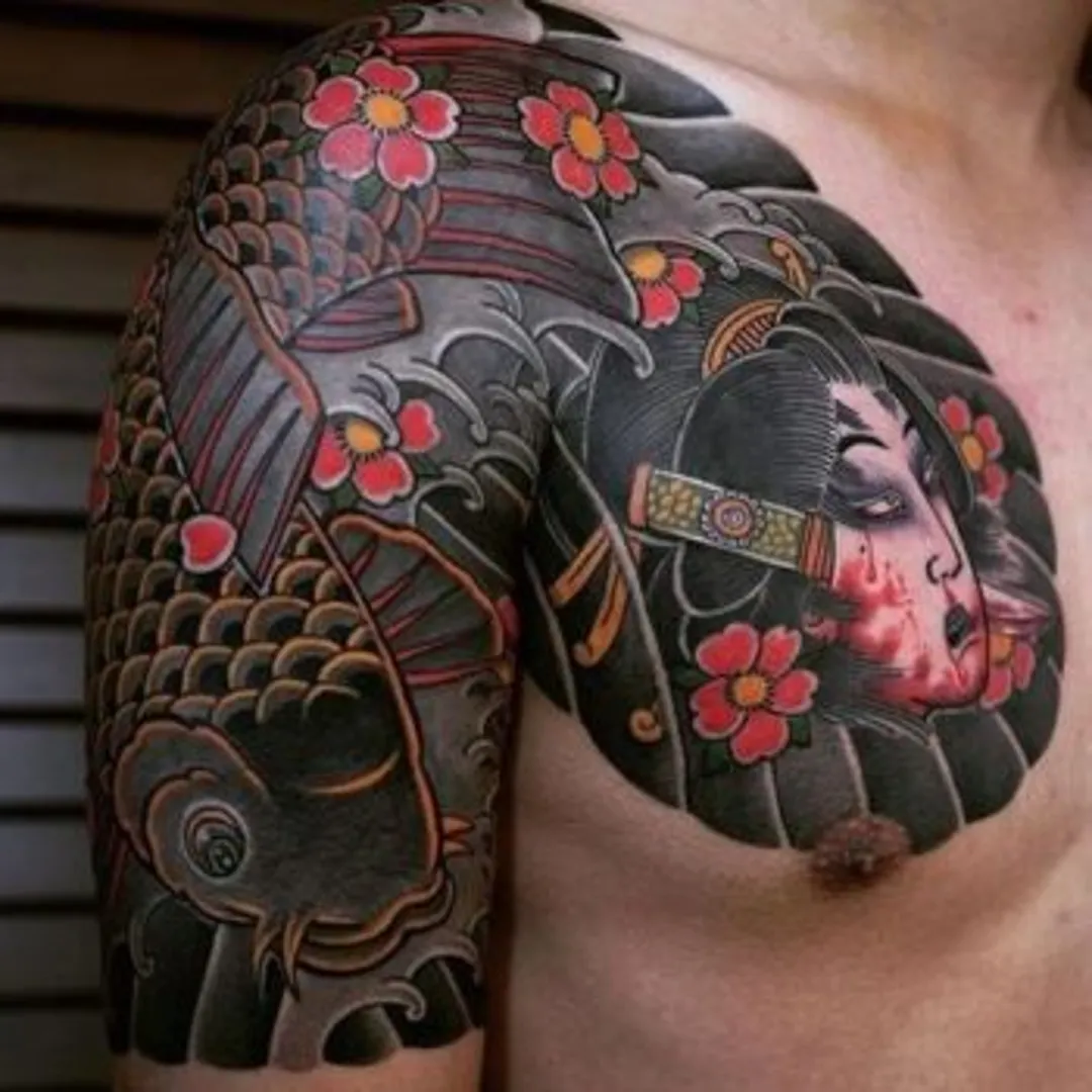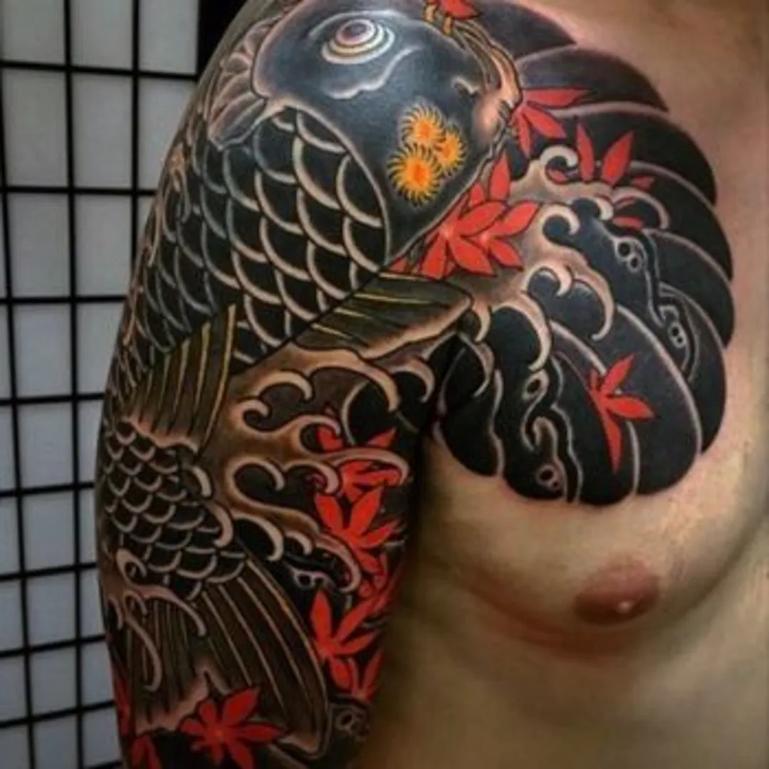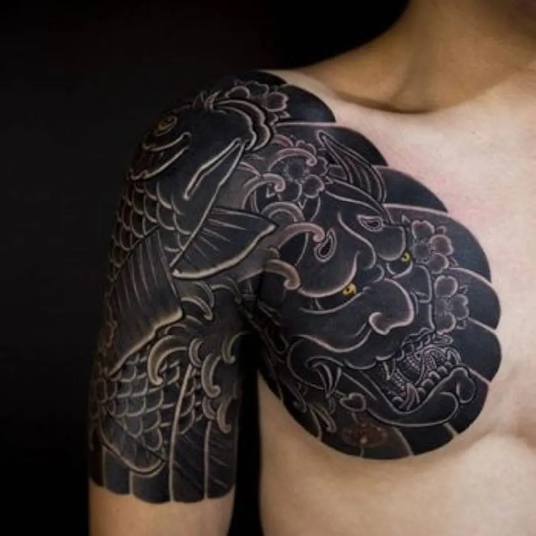 Японская татуировка основана на очень сильном черном фоне, а главная фигура немного окрашена. Если кому-то нравится дракон, или какой-то самоуверенный самурай, они являются действительно сильными и востребованными персонажами, но важно помнить, не следует все вещи подряд называть «традиционными», если они не наследуют традиции. Вместо этого используйте их основу, как новую интерпретацию. Некоторые эскизы никогда не выходят из моды — драконы, карпы кои, маски Ханни и японские цветы.