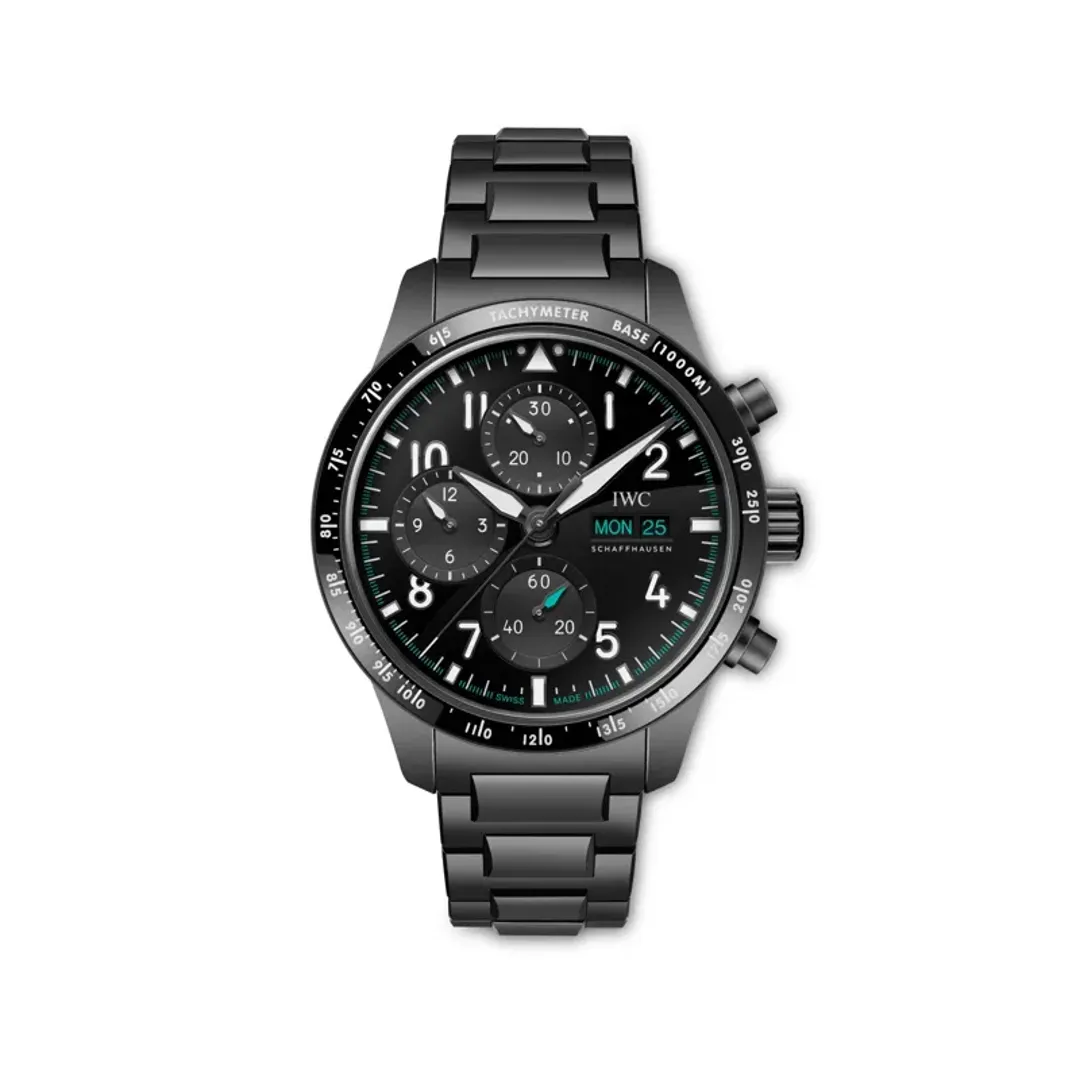 Модель Pilot’s Watch Performance Chronograph 41 AMG выполнена из матового титана — материала, используемого IWC с 1980 года благодаря своей прочности и легкости. Наряду с ним IWC предлагает модель Pilot’s Watch Performance Chronograph 41 Mercedes-Amg Petronas Formula One Team с корпусом из Ceratanium — разработанного компанией материала, сочетающего легкость и структурную целостность титана с твердостью и устойчивостью к царапинам, сравнимой с керамикой.