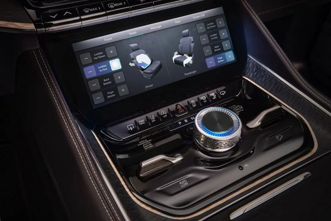 В соответствии с современными трендами, внутри Grand Wagoneer повсюду установлены экраны. Сорок пять дюймов общей поверхности дисплея, если быть точным. К ним относятся 12,3-дюймовый цифровой монитор, емкостный 12,1-дюймовый центральный сенсорный экран и 10,25-дюймовый экран для пассажира.