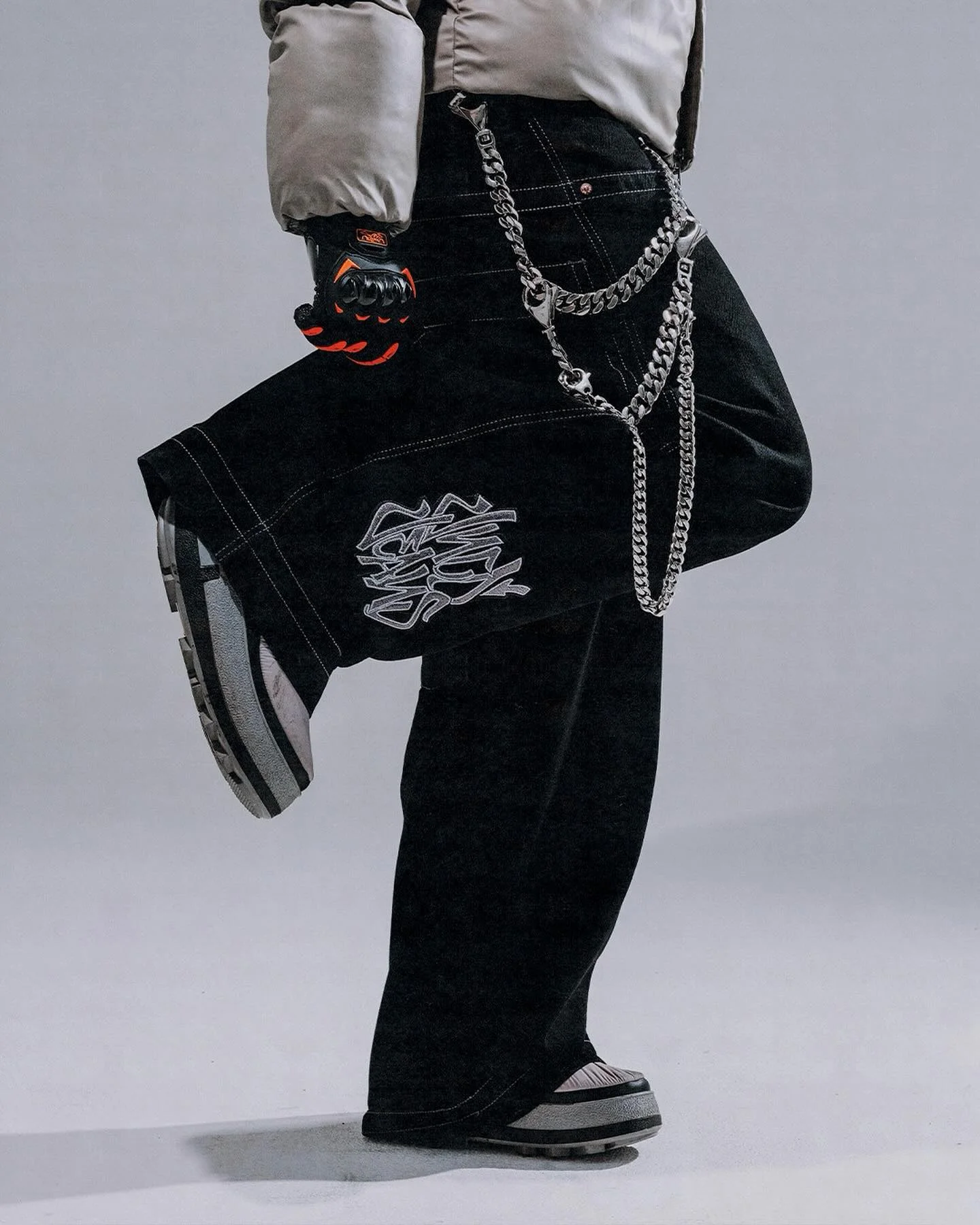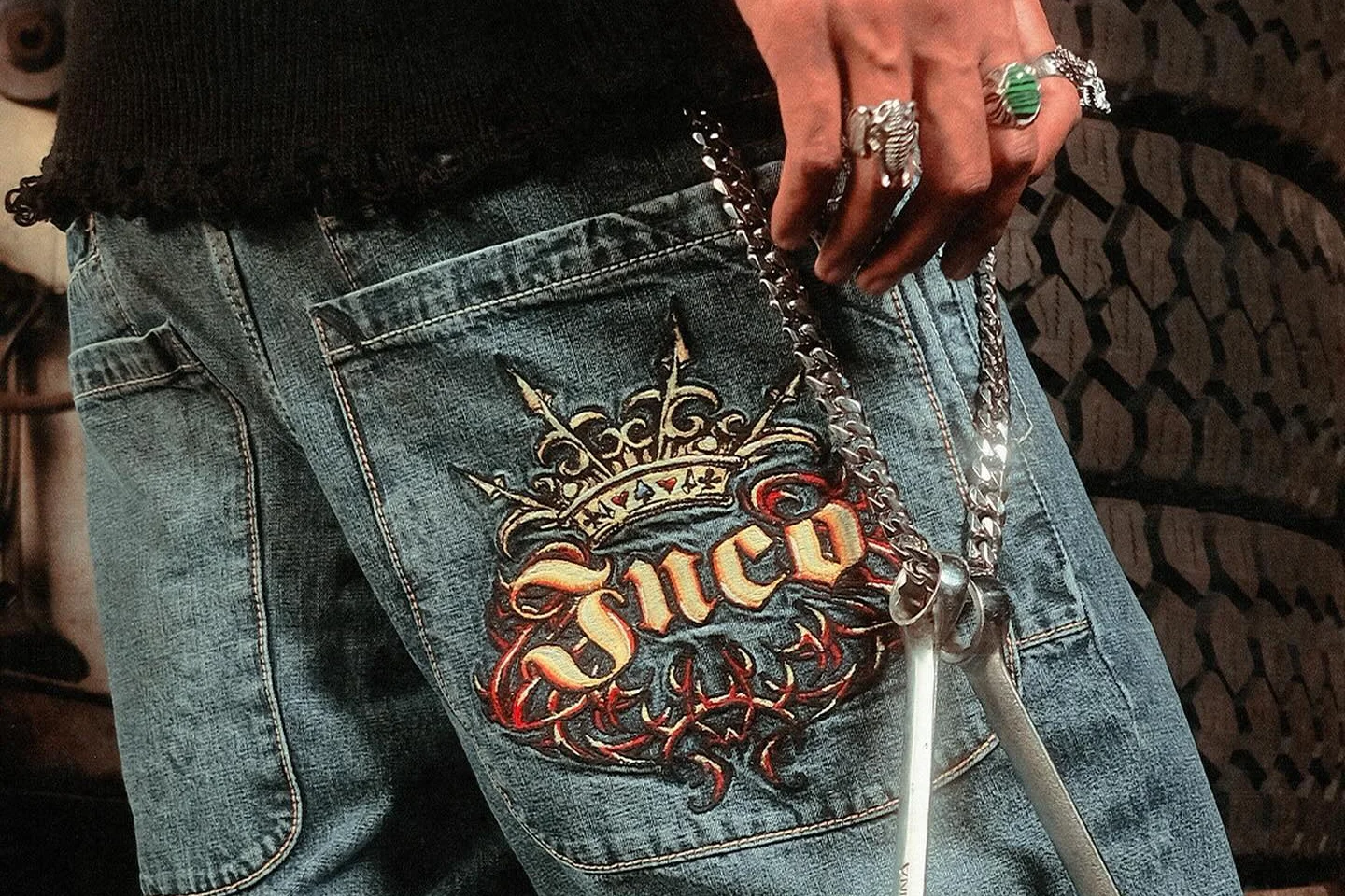 Дело не только в щедрых пропорциях. Еще одна отличительная черта современных макро-джинсов - наличие броской надписи сзади, вышитой или нанесенной, или даже огромной графики, имитирующей краску или граффити: чем больше панка и эддизма, тем лучше. И конечно, если вы спросите об тренде любого миллениала, первое, что придет ему на ум, – это брюки JNCO. Этот бренд, родившийся в Калифорнии в 1985 году, добился огромной популярности в 1990-х годах именно благодаря его преувеличенной, максималистской эстетике. Некоторым хип-хоп-стритвир брендам удалось выдержать испытание временем лучше или хуже, например, Karl Kani или Ecko UNLTD, но JNCO был предан забвению.