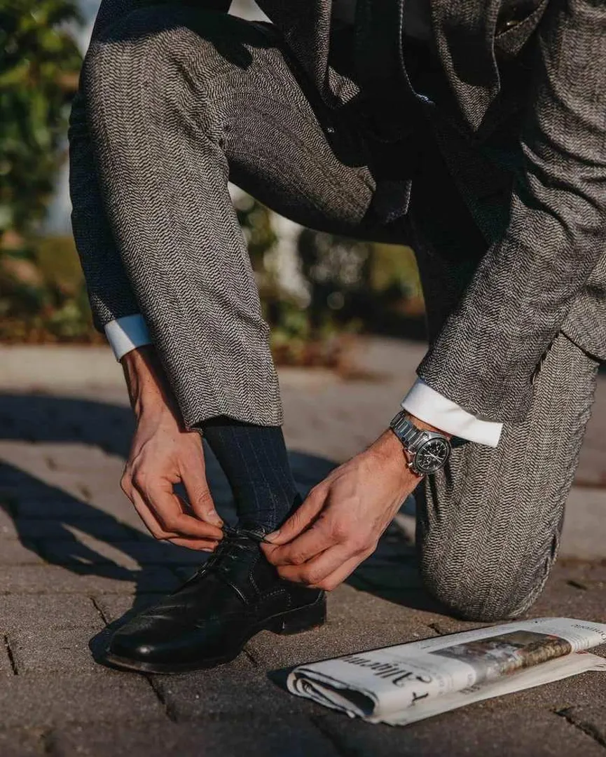 Что касается носков, удостоверьтесь, что они достаточно длинные, чтобы, когда вы сидите, не было видно ног. Простой способ проверить, подходит ли длина носков, – просто сесть и скрестить ноги в обе стороны, чтобы увидеть, не видно ли кожу. Если видна какая-либо часть ног, возьмите носки подлиннее, и никогда, никогда не надевайте носки белого цвета с костюмом или примете неверное решение, обойтись вообще без носков.