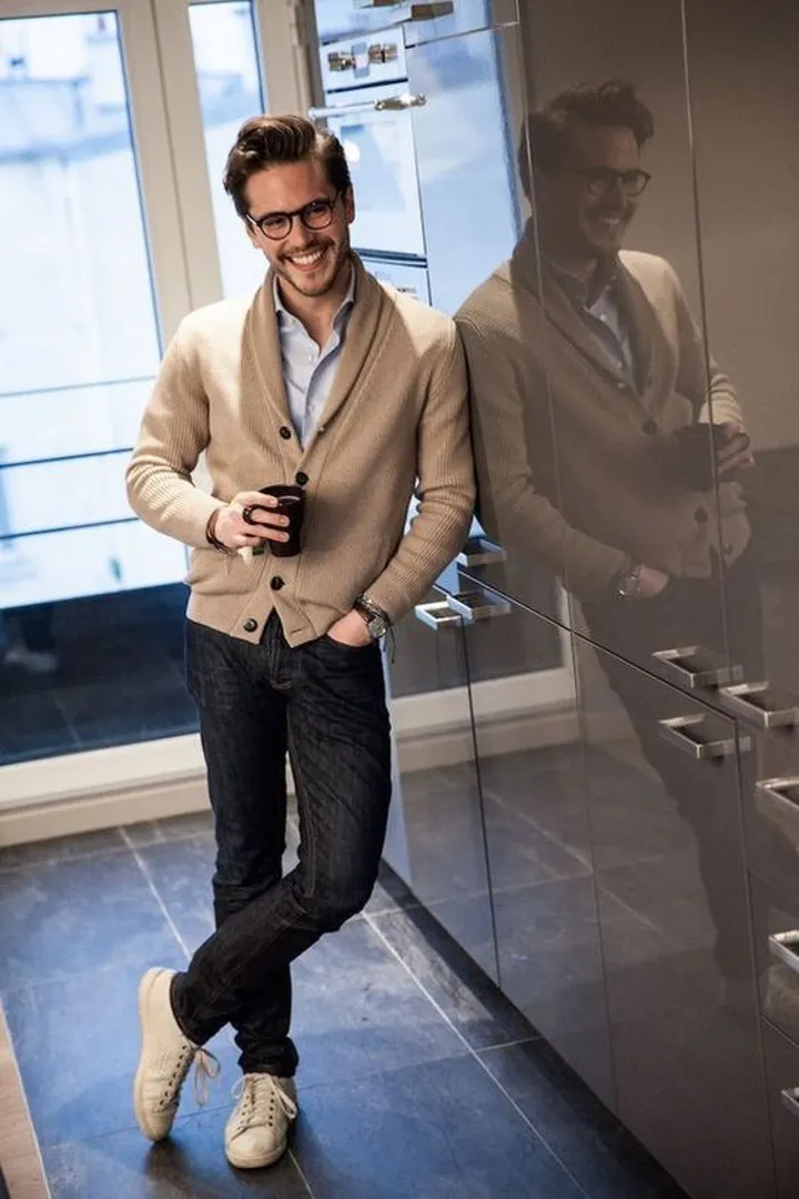Для дополнительного интереса оставьте цвета приглушенными или тональными и поиграйте с пропорциями. Заправьте рубашку в укороченные брюки. Более большой отрыв от талии сделает длину кардигана более привлекательной. Закончите образ с некоторой неопрятной, но нормальной обувью. Вполне сгодятся пара ботинок дерби.