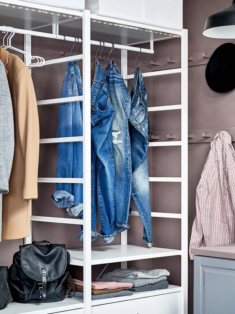 Когда дело доходит до хранения, стоит отнестись к джинсам и курткам внимательнее чем к другим предметам одежды. «Чтобы точно знать, что правильные складки не повредятся, наденьте джинсовую ткань на спинку стула или повесьте ее», — говорит эксперт по джинсовой ткани Лорна Барфорд из The Jeans Blog. «Сырой деним чрезвычайно долговечен, а жизнь в сырых джинсах — это только половина дела, поэтому, если вы носите их все время, хранение не имеет большого значения».