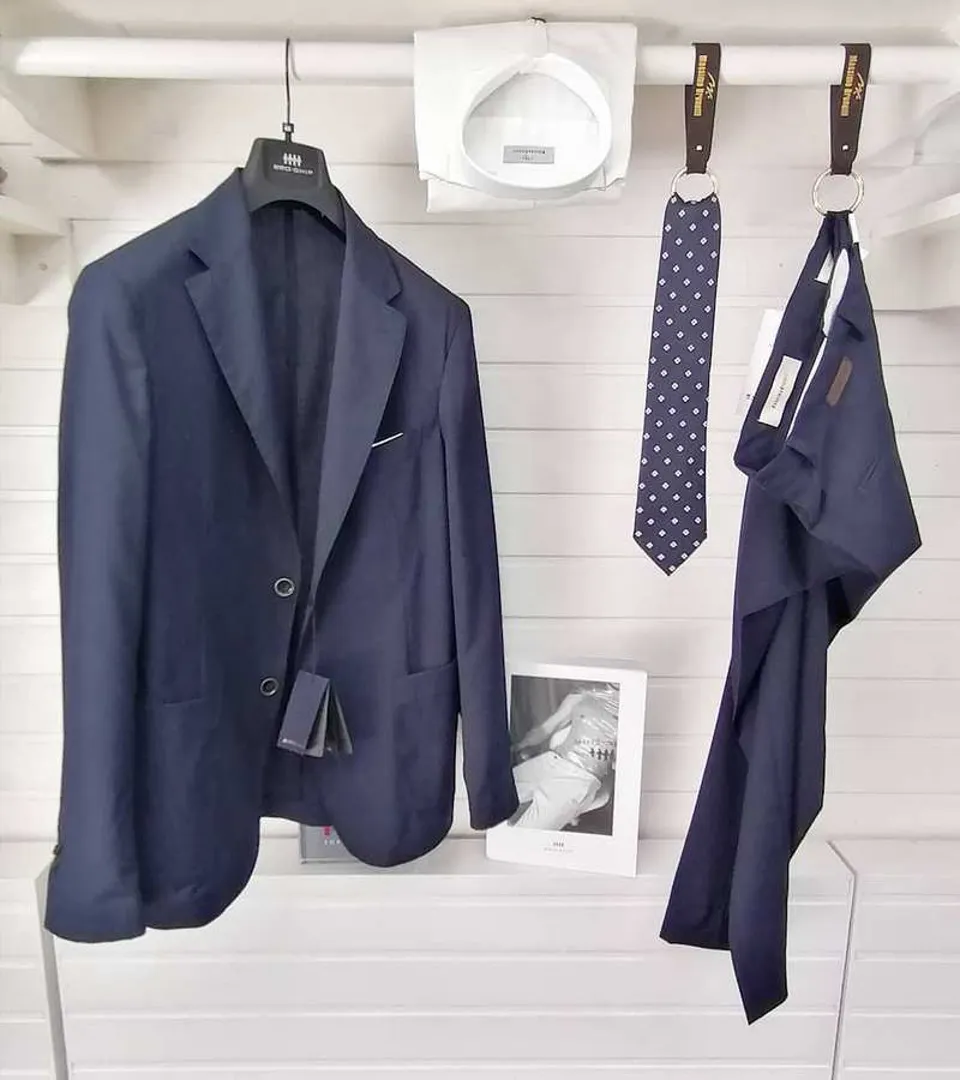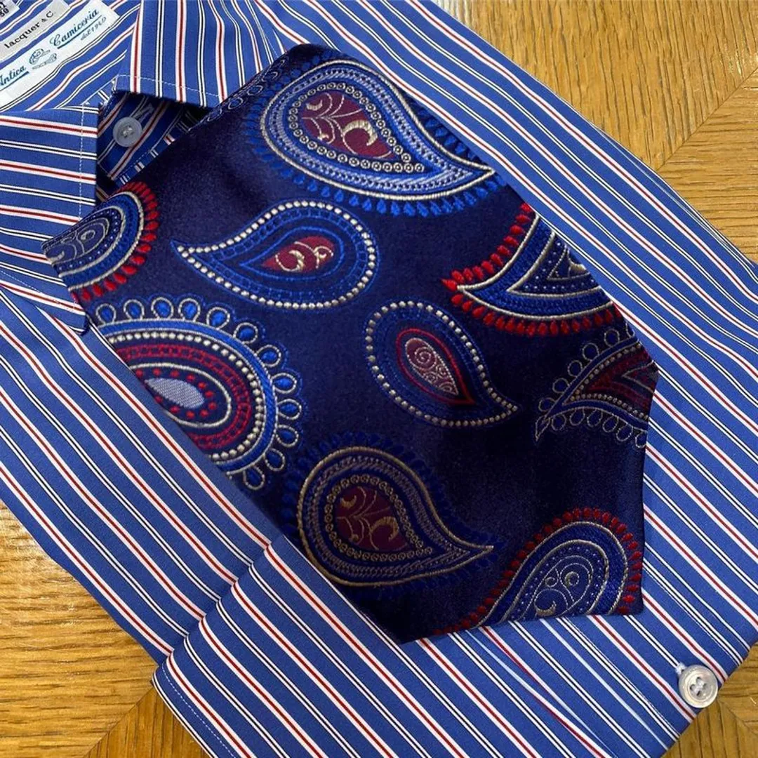 Мы всегда рекомендуем для галстуков сдержанные, глубокие оттенки, такие как голубой или бордовый. Галстуки – это точка внимания, поэтому они сразу бросаются в глаза, и люди часто судят о вашем характере по ним. Никакого давления. Что касается рубашки? Вы не ошибетесь, если выберете белоснежную модель. Она станет идеальным чистым холстом, который можно смело сочетать с выбранным аксессуаром.