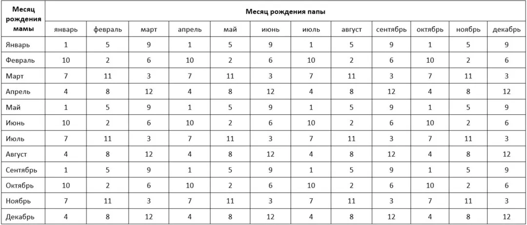Данная таблица может значительно повлиять на зачатие именно мальчика. В этой таблице необходимо найти число пары. Горизонтальная строка является мужской, в ней нужно найти и отметить месяц в котором родился мужчина. Вертикальный столбец – женский, в нем нужно отметить месяц, в котором родилась женщина. Число пары определяется по тому месту, где эти два столбца пересеклись. На специальном графике необходимо найти получившуюся цифру и посмотреть наиболее благоприятный месяц для зачатия мальчика, как правило, подходящих месяцев несколько, каждый из них отличается благоприятностью. То есть, например, для пары идеальным является октябрь, в этом месяце наибольшая вероятность зачать мальчика. В апреле и марте вероятность значительно уменьшается.