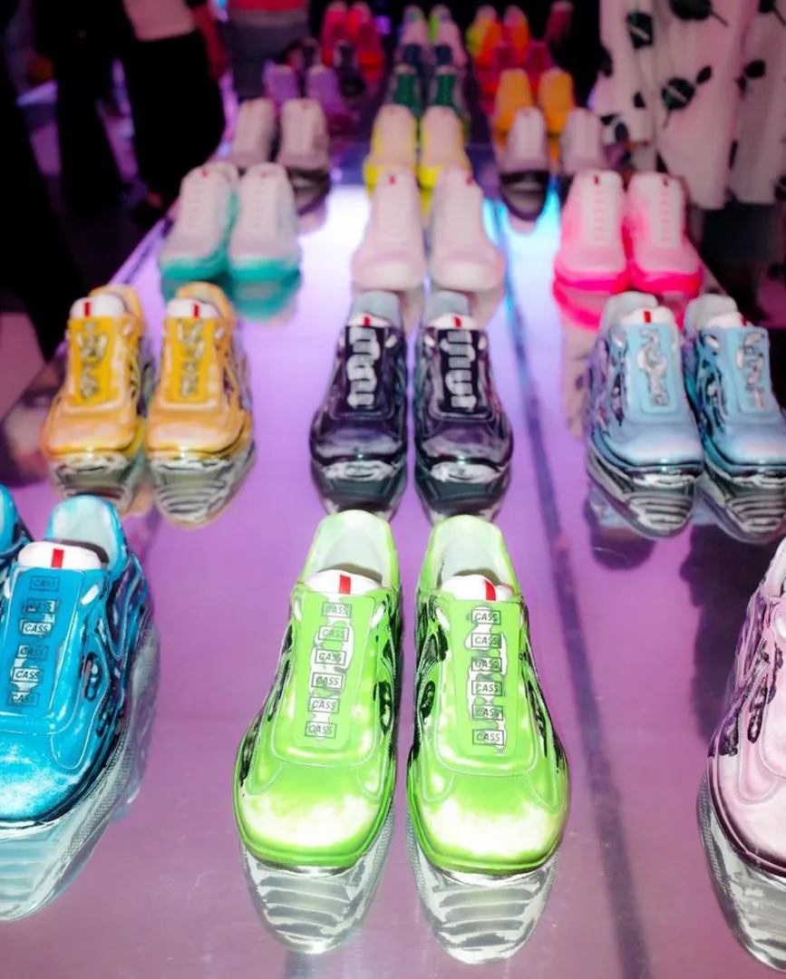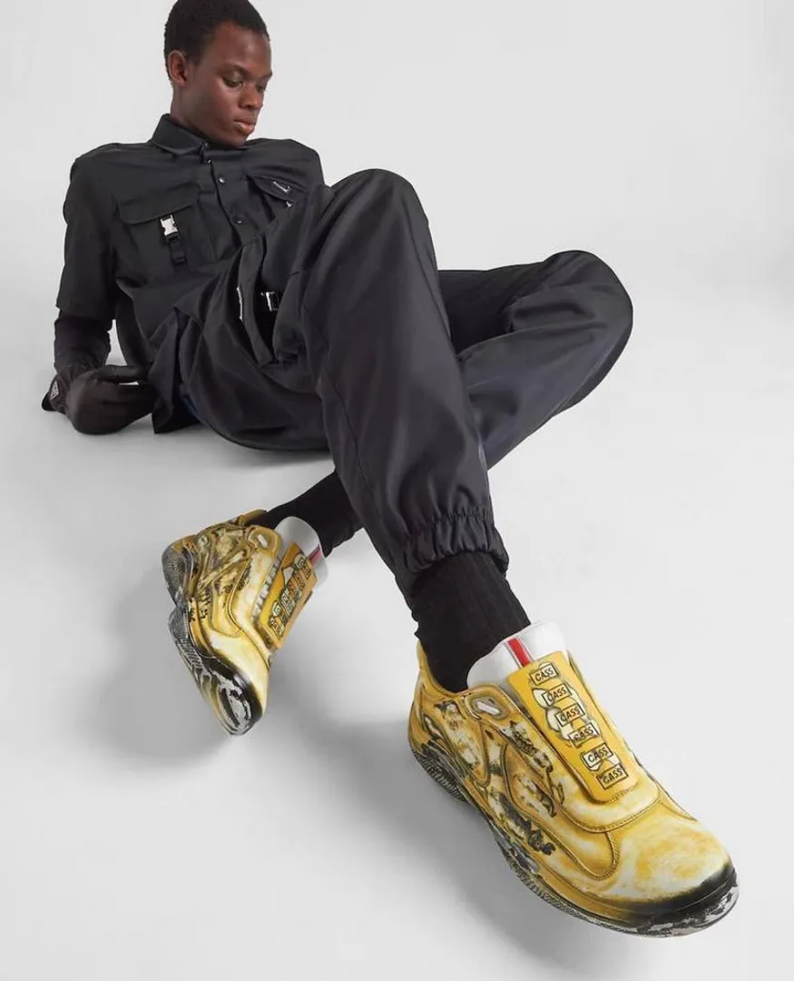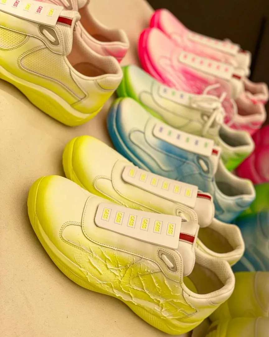 После поездки на производственную фабрику Prada в Тоскане, художественную студию Касса до потолка завалили коробками с кроссовками Кубка Америки, культовым дизайном, представленным брендом Prada в 1997 году для членов парусной команды Luna Rossa.