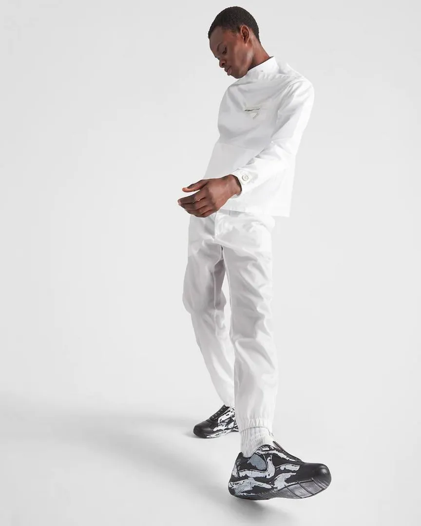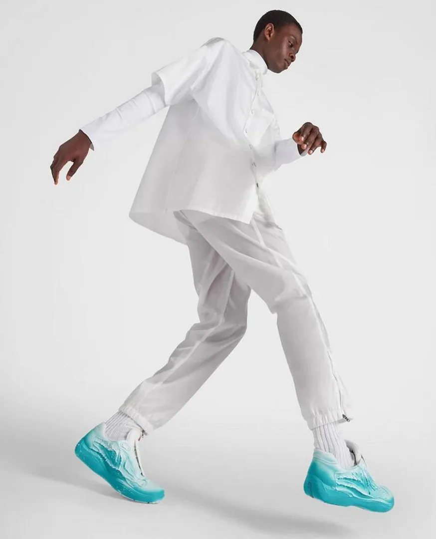Вместо запланированного Касс раскрасил более 80 пар кроссовок, чтобы создать четыре окончательных образца (в 22 цветах), демонстрирующие его взгляд на шелковисто-гладкие оттенки и тонкие текстурные украшения. Будучи поклонником нейлоновой одежды Prada – «Там есть куртка без рукавов с капюшоном, которую я увидел и подумал: «Вау, это потрясающе»», – он сразу же обратил внимание на белый «холст», на котором изображен Кубок Америки.