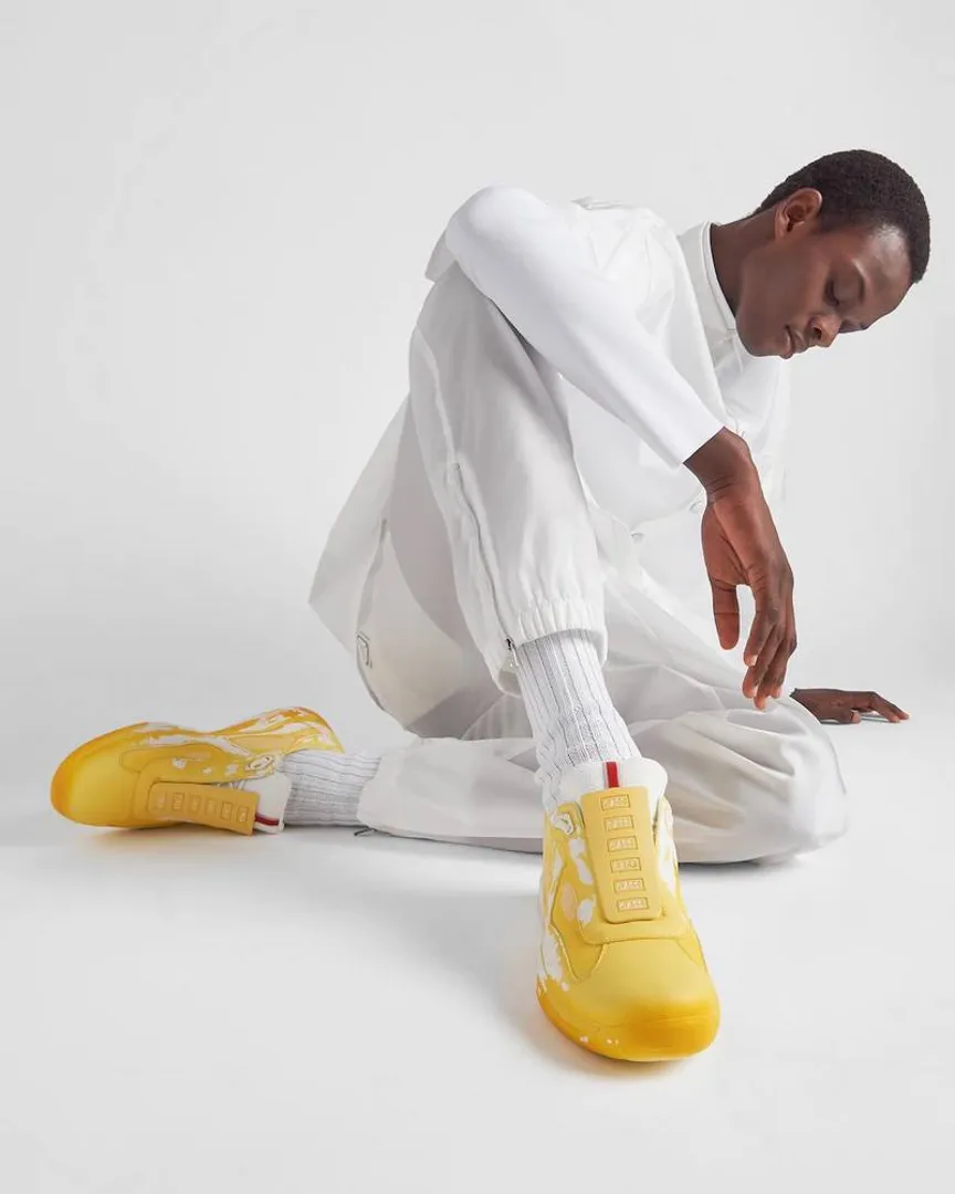 Поэтому, когда Миучча Прада предложила художнику Кассиусу Аттикусу Херсту сделать что-то вместе для Prada, Касс отреагировал так, словно это был сон. Конечно, предложение не было похоже на реальность, – переговоры велись через приложение Zoom из его студии в Лондоне. Но она была настроена серьезно, и сегодня 22-летний юноша может зайти в любой в мире флагманский магазин Prada и найти пару кроссовок Prada «Кубок Америки» (America’s Cup) с своим именем.