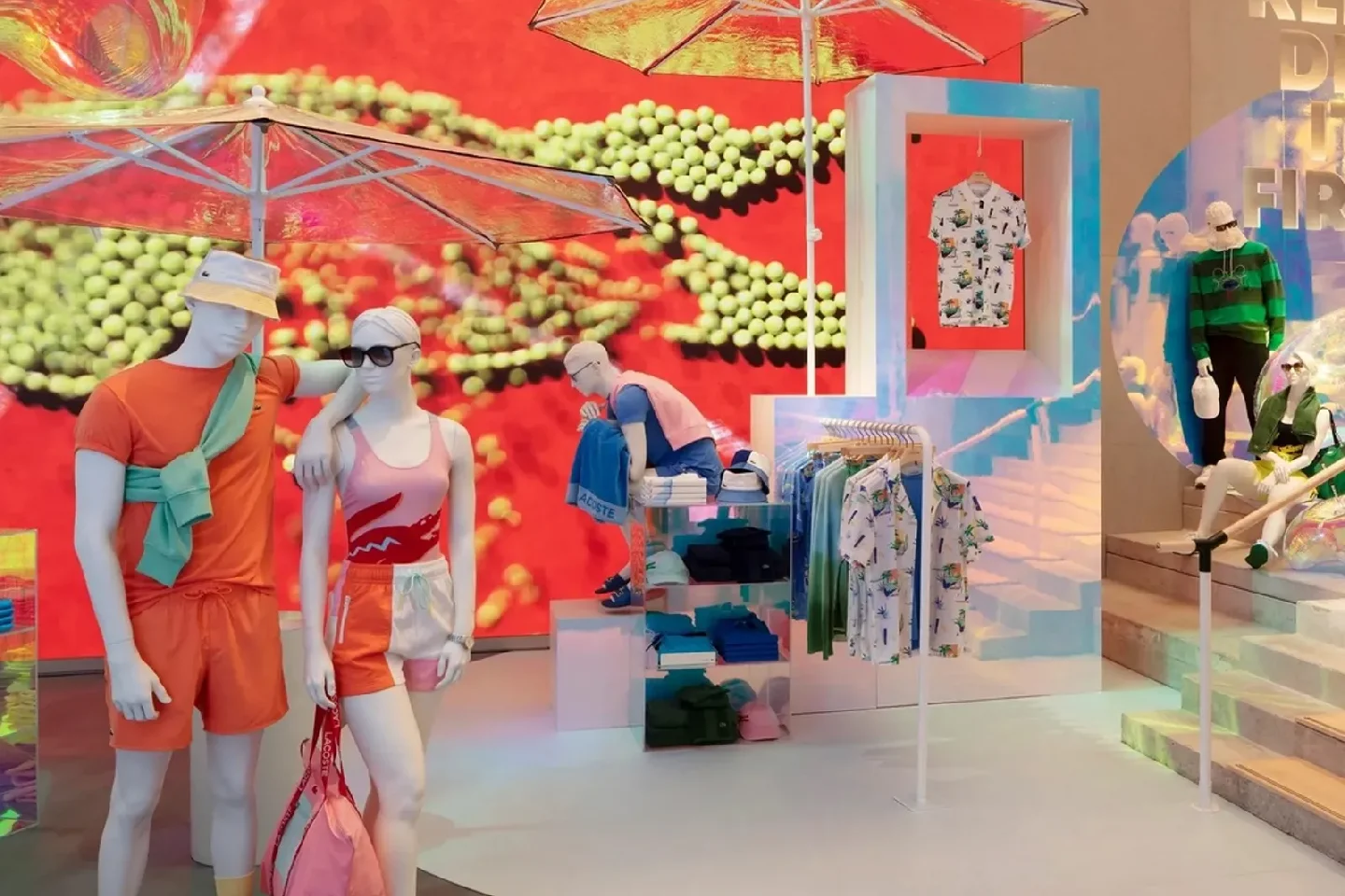 9 500 наименований товаров, от обуви до готовой одежды, представлены на выставке для мужчин, женщин и детей. Художественные и интерактивные произведения искусства, связанные с Фотобудкой, внесут свой вклад в уникальность этого места, наряду с другими пространствами, такими как «уголок экологичности». Названный «Долговечная элегантность», он отражает приверженность Lacoste к экологичной моде.