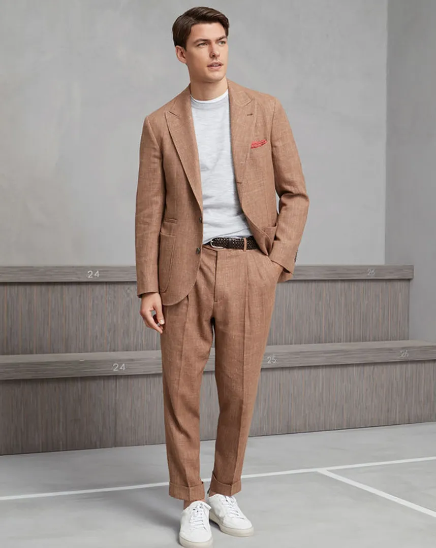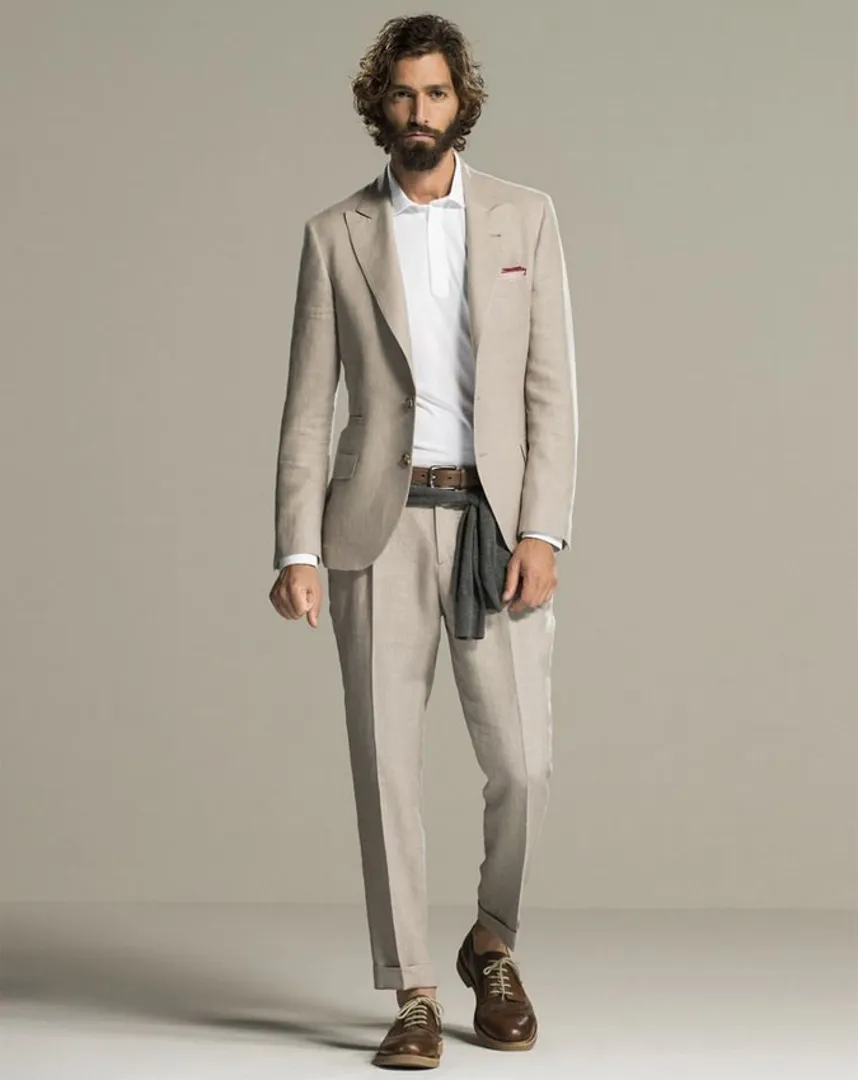 Хорошая вещь льняного костюма заключается в том, что со временем вы начнете отклоняться от стандартных шаблонов пока полностью не отойдете от классической формальности костюма. Он станет не более повседневным и простым чем футболка. Но если вы попробуете комбинировать одно с другим, то советуем поиграться с нейтральными цветами.