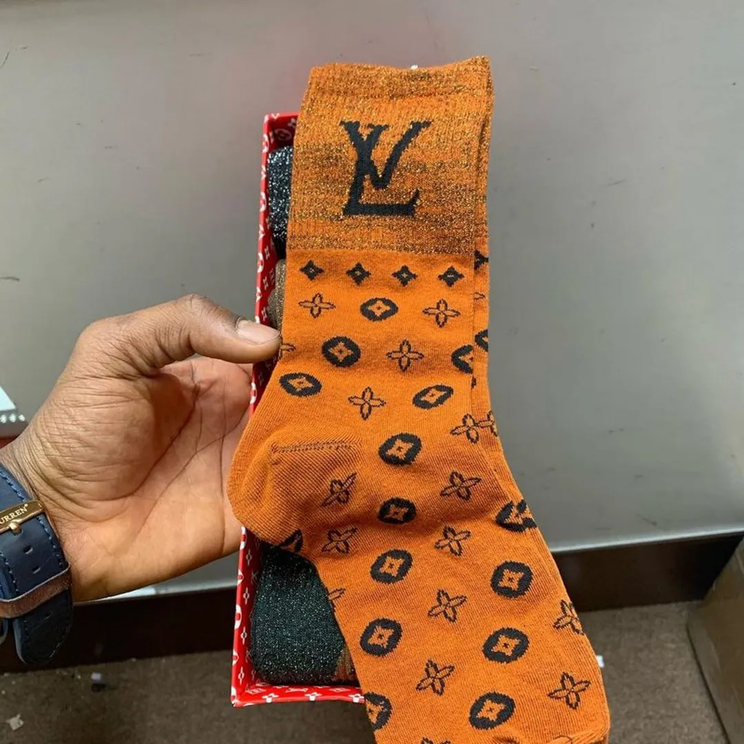 Компания производит парфюм и разные элементы одежды, среди них – носочная продукция. Мужские модели выполнены в темных оттенках. На каждой паре есть достаточно крупное изображение бренда, оно располагается либо в верхней части пары, либо на подошве. Материал – 100% хлопок. Изделия легко удастся включить в образ для деловых встреч.