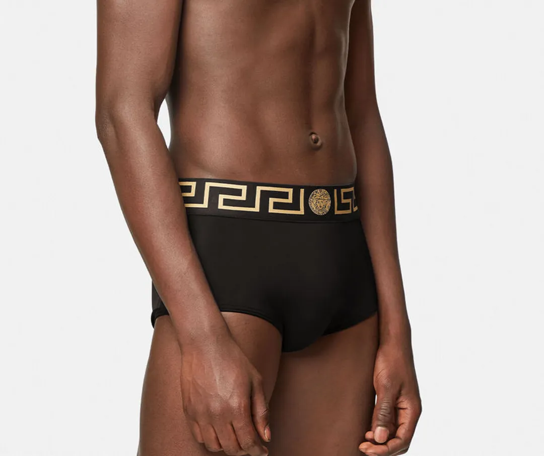 Широкая эластичная резинка-пояс плавок черного цвета украшена вышитым золотым логотипом и греческим орнаментом, который невозможно перепутать с дизайном других брендов.