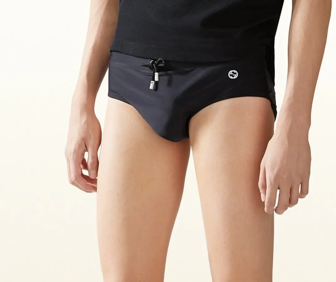 Знаменитый итальянский дом моды Gucci не упускающий возможности шокировать своих поклонников экстравагантным дизайном и принтами, как и многие бренды склонил чашу весов в пользу плавательных шорт. Без сомнений классика встречается, но из коллекций прошлых сезонов.