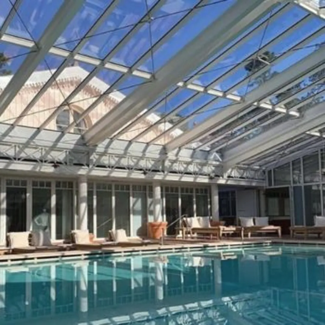 Публикуем в Instagram: вид на бассейн с навесом, похожим на палатку. Озеро и горы на дальнем плане добавят немного пикантного контекста.