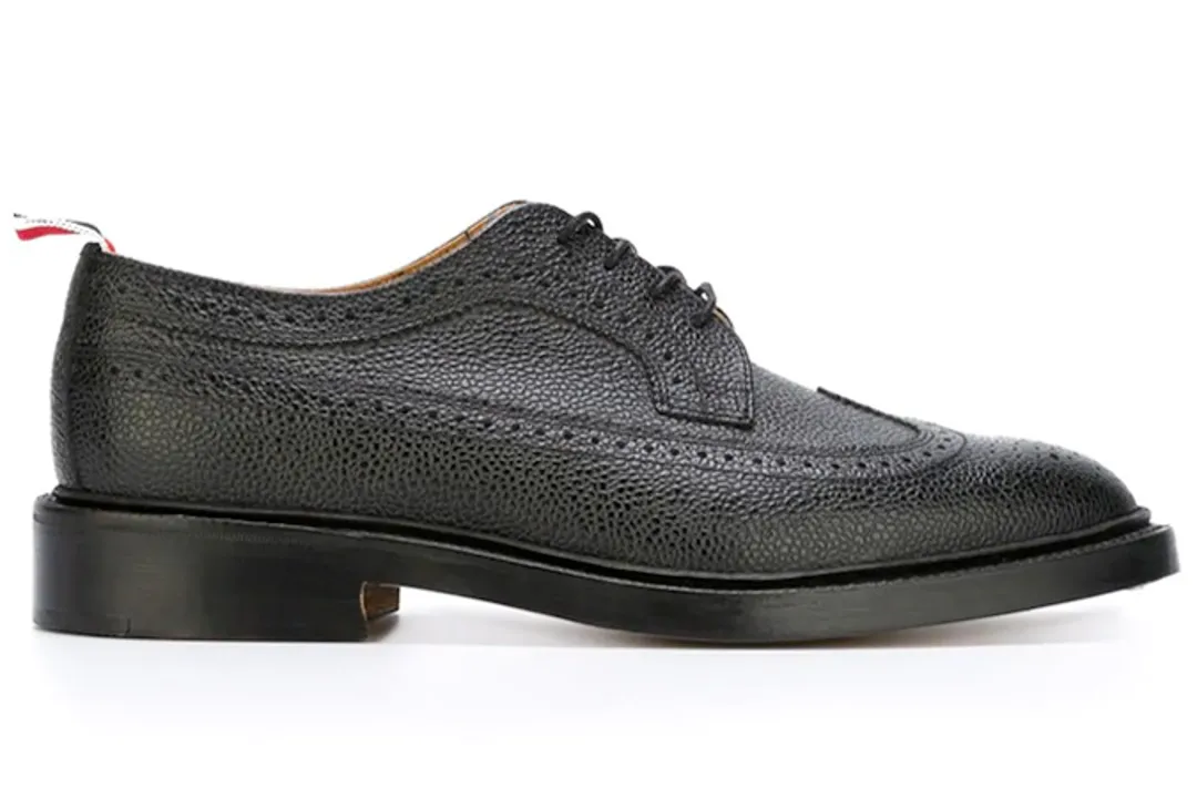 Менее формальные, чем стандартная гладкая кожа, но не менее изящные, чем зернистая кожа, Thom Browne предлагает новое текстильное восприятие стандартных Брог.