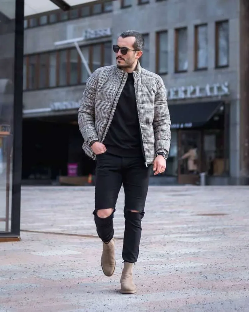 Если многие элементы наряда для дождливого дня относительно темные, вы можете разбавить весь этот черный цвет с помощью куртки с узором и, возможно, пары коричневых ботинок для привлечения внимания ко всему внешнему виду.