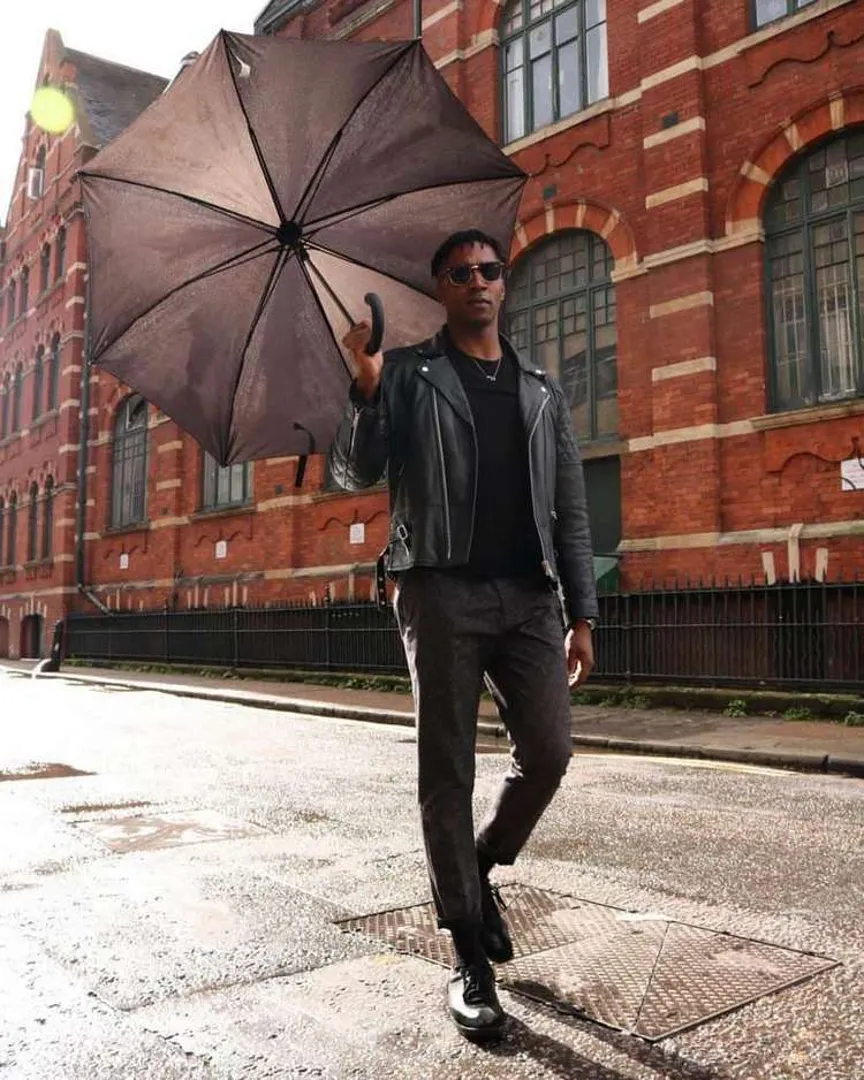 Элегантный повседневный наряд для дождливого дня не обязательно должен означать супер-изысканную куртку. Черная кожаная куртка с классическими брюками и лоферами также станут хорошим примером.