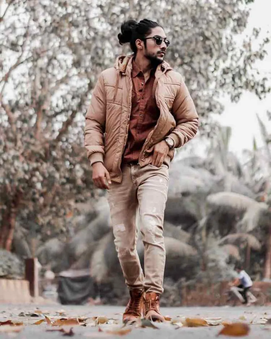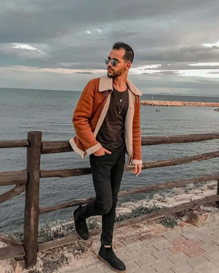Кроме этого, вы также можете сделать весь наряд полностью спортивным, надев серую толстовку с капюшоном под черную кожаную куртку и спортивные кроссовки. Конечно, одежда для хмурой погоды не обязательно должна быть полностью черной. Коричневая водолазка, светло-коричневая куртка и синие джинсы сделают внешний вид легким.