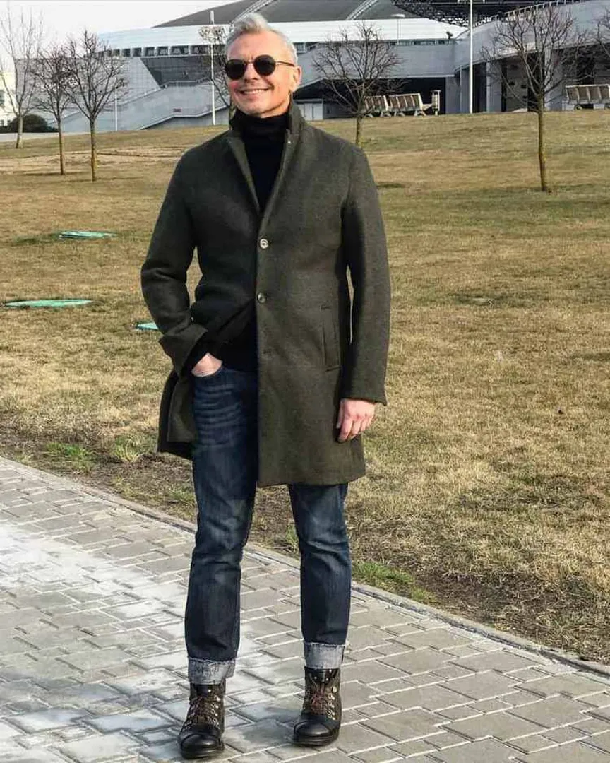 Мужской наряд для дождливого дня в стиле Смарт кэжуал не обязательно должен включать классические брюки и спортивную куртку. Элегантный скромный жакет из шерстяного материала отлично дополнят синие джинсы. Добавьте черную водолазку для максимальной роскоши.