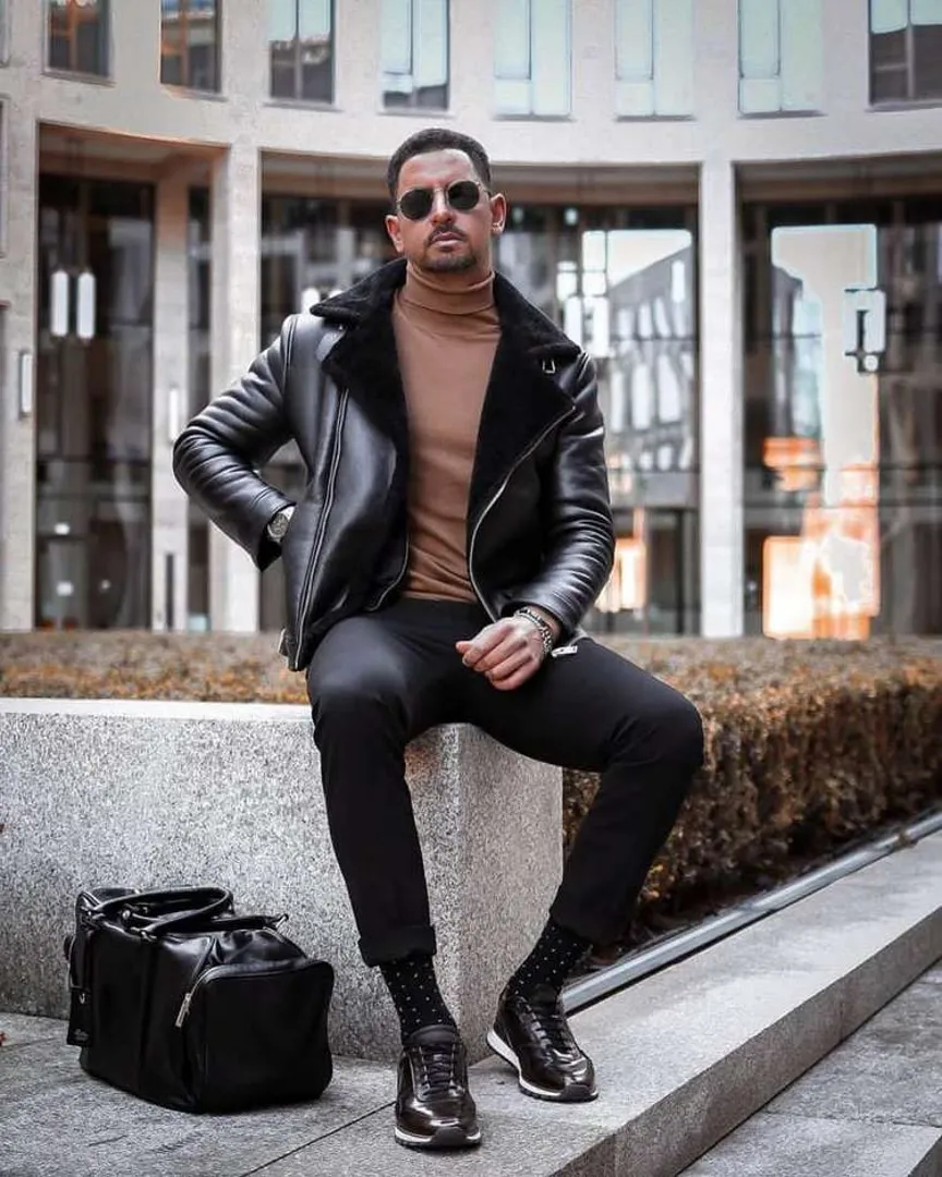 Держите основные элементы вашего наряда супер-шикарными и простыми, с помощью черных брюк и коричневой водолазки. К ним добавьте такие аксессуары, как черную кожаную куртку и пару спортивных кроссовок, способных показать под ними носки с рисунком. Или попробуйте идентичный образ с синими джинсами и поясной сумкой в качестве аксессуара, привлекающего внимание.