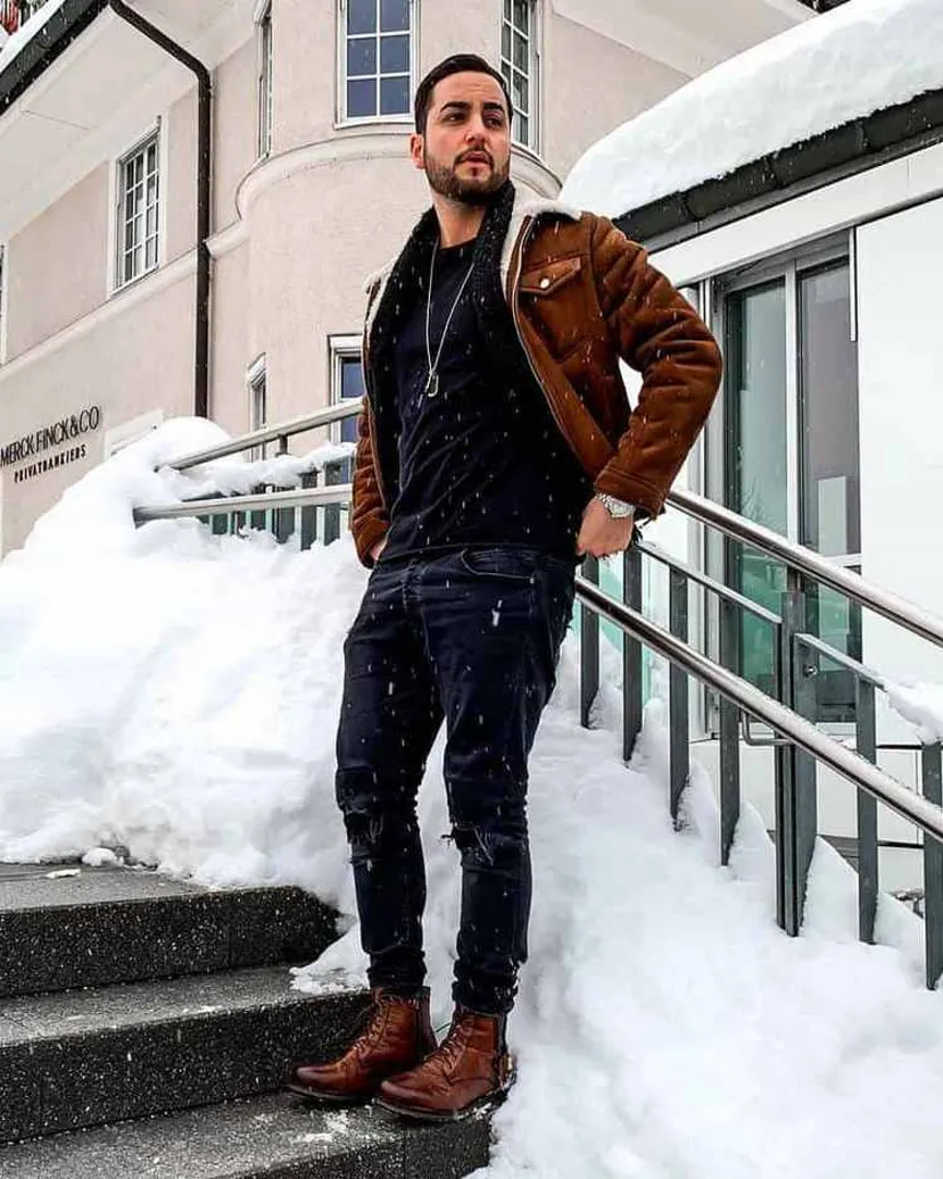 Если у вас есть дизайнерская куртка, которой вы очень гордитесь, дождливый день – идеальное время ее продемонстрировать. Чтобы по-настоящему привлечь внимание к коричневой куртке, наденьте полностью черный наряд: водолазка, джинсы скинни и ботинки.