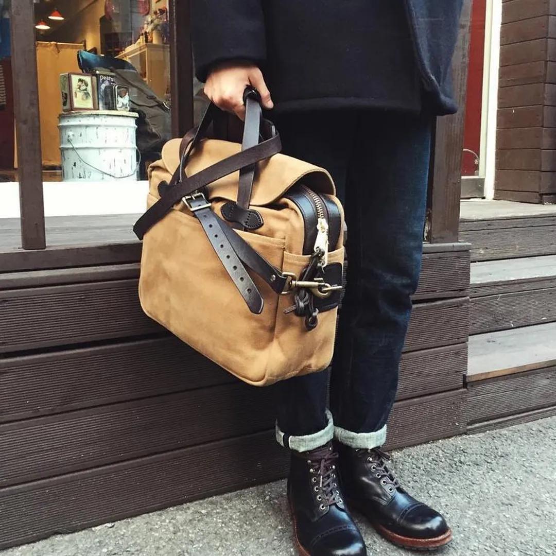 Выбор золотоискателей Юкона на рубеже 20-го века: скорее всего, они носили свои пожитки в сумке бренда Filson. У компании Filson настоящее наследие; она сделала себе имя, экипируя лесорубов и пионеров, боровшихся с дикой природой Америки. Сумки представлены в широком цветовом ассортименте, различных вариантах и изготовлены из фирменной саржи и жесткой ткани – прочного хлопкового холста, который можно многократно обрабатывать воском для водонепроницаемости.