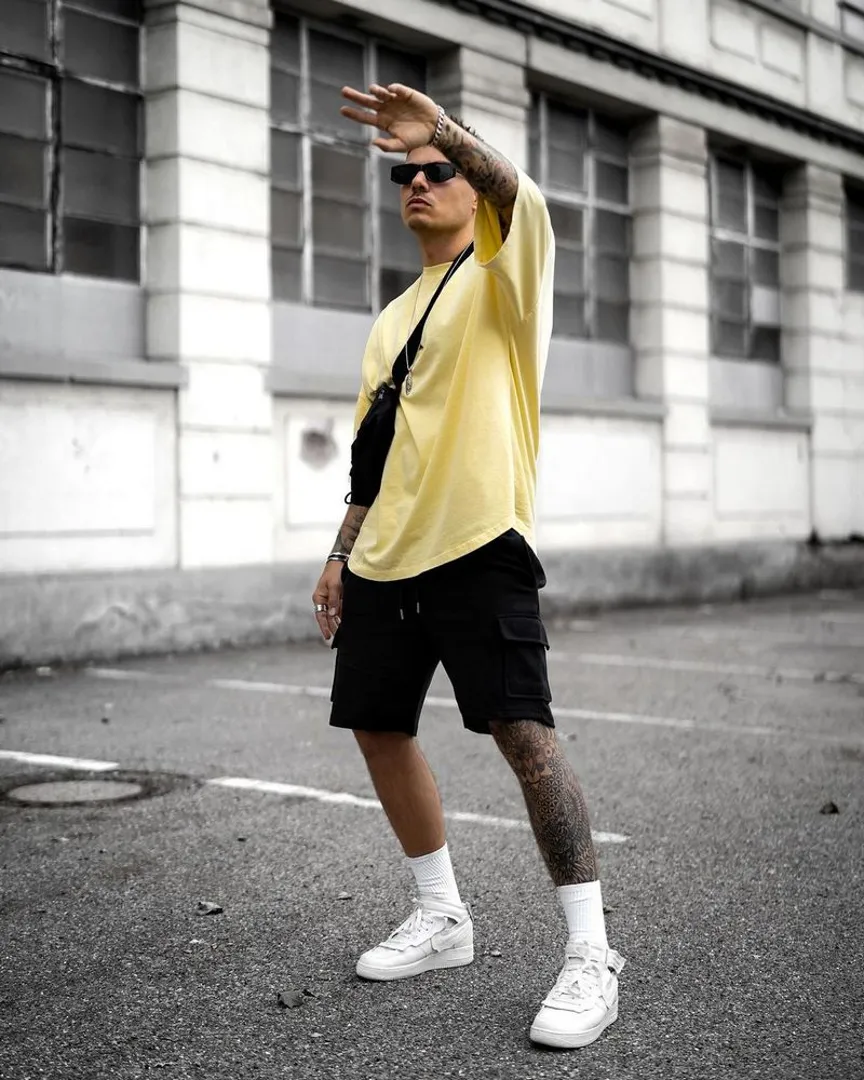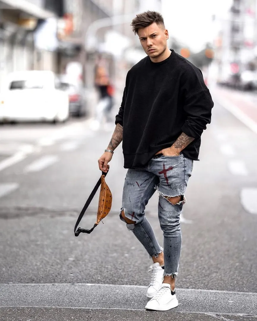 Бейсболка с загнутым козырьком возвышается над безразмерной футболкой с огромным рисунком, беспорядочно заправленной за пояс свободных джинсов. Под ними – пара внушительных громоздких кроссовок с тугой шнуровкой, такие, какие носили на уроки физкультуры в средней школе утром, днем и вечером в 90х годах. И, в довершение всего, обязательная небольшая сумка (она же кросс-боди).