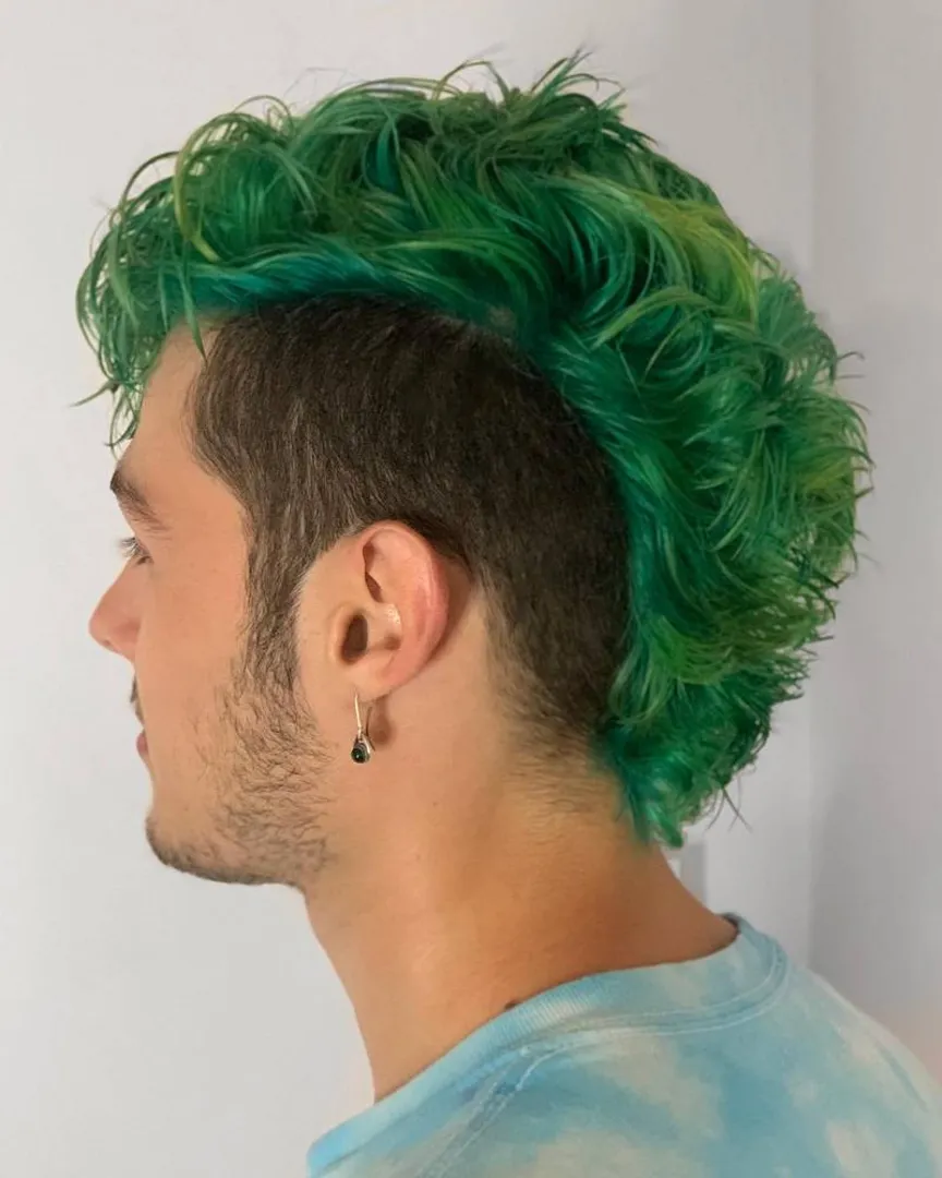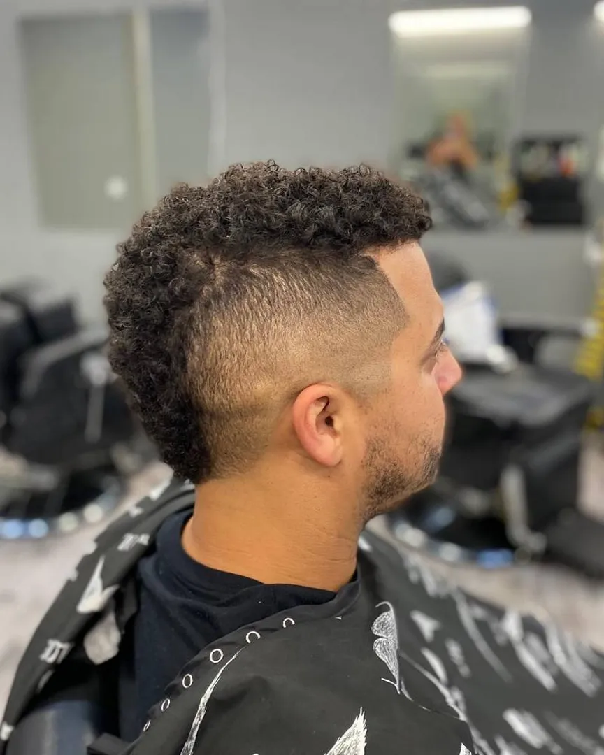 Стрижка ирокез с мужскими вьющимися волосами также выглядит очень круто, как с полностью выбритыми сторонами, так и с фейдом.