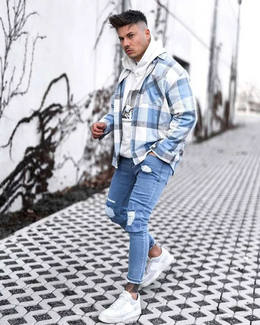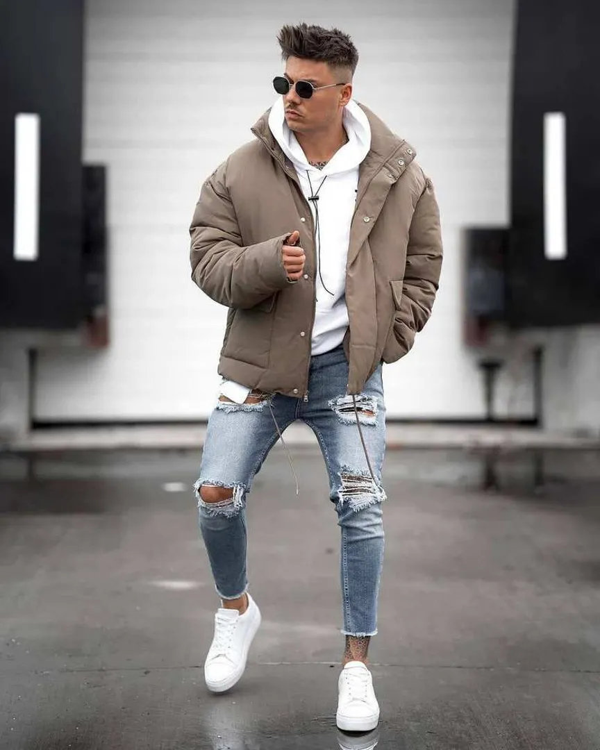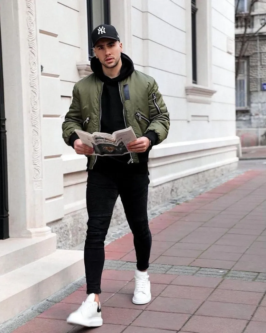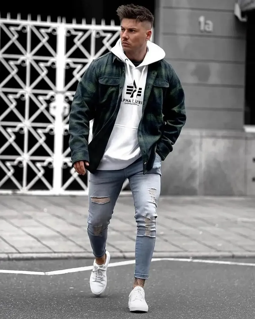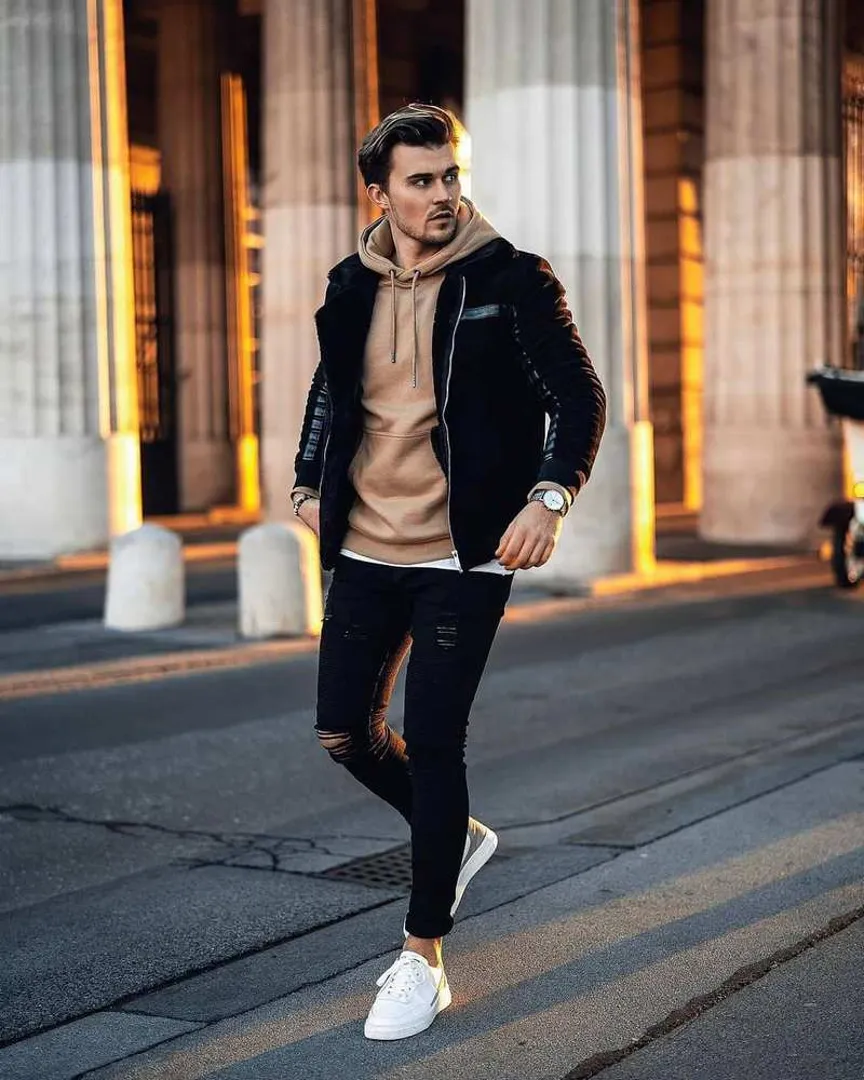 Для создания правильного образа носите толстовку с молнией поверх обычной белой футболки с круглым вырезом, дополните ее курткой или пальто, узкими джинсами и парой новых кроссовок.