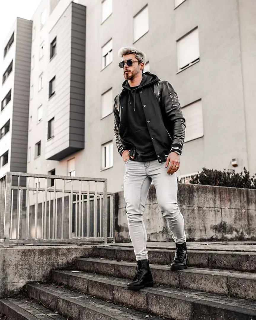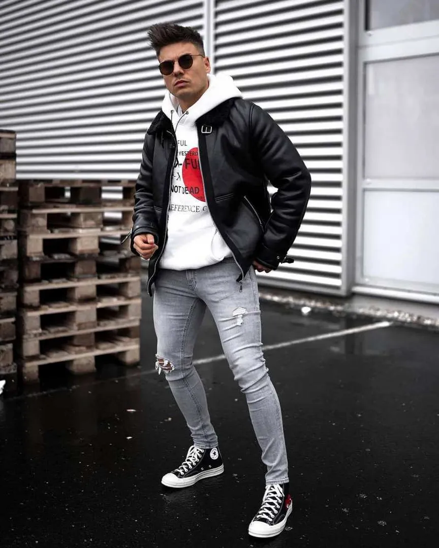 Выбирая в качестве базовой модели кожаную куртку черного цвета и джинсы цвета индиго, подберите к верхней одежде толстовку другого цвета и дополните образ кожаными или замшевыми ботинками Челси.