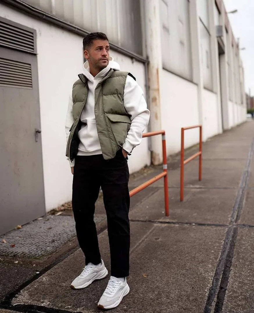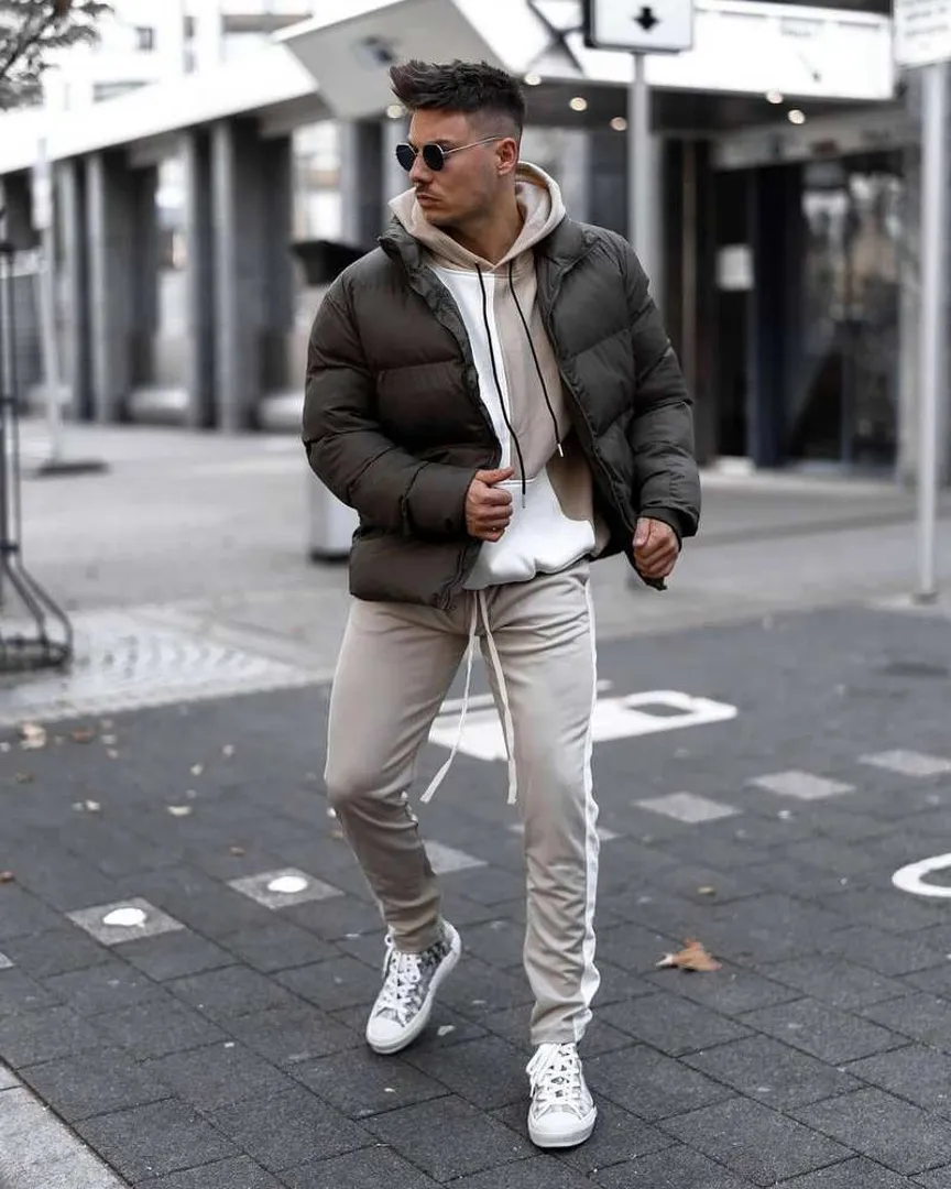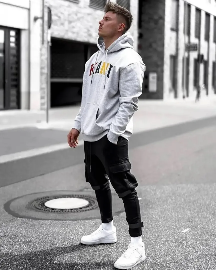Выберите толстовку нейтрального цвета, затем добавьте пару брюк и спортивные кроссовки. Если настроены смело, попробуйте добавить небольшой принт на нижнюю часть, например, полоски или клетку.