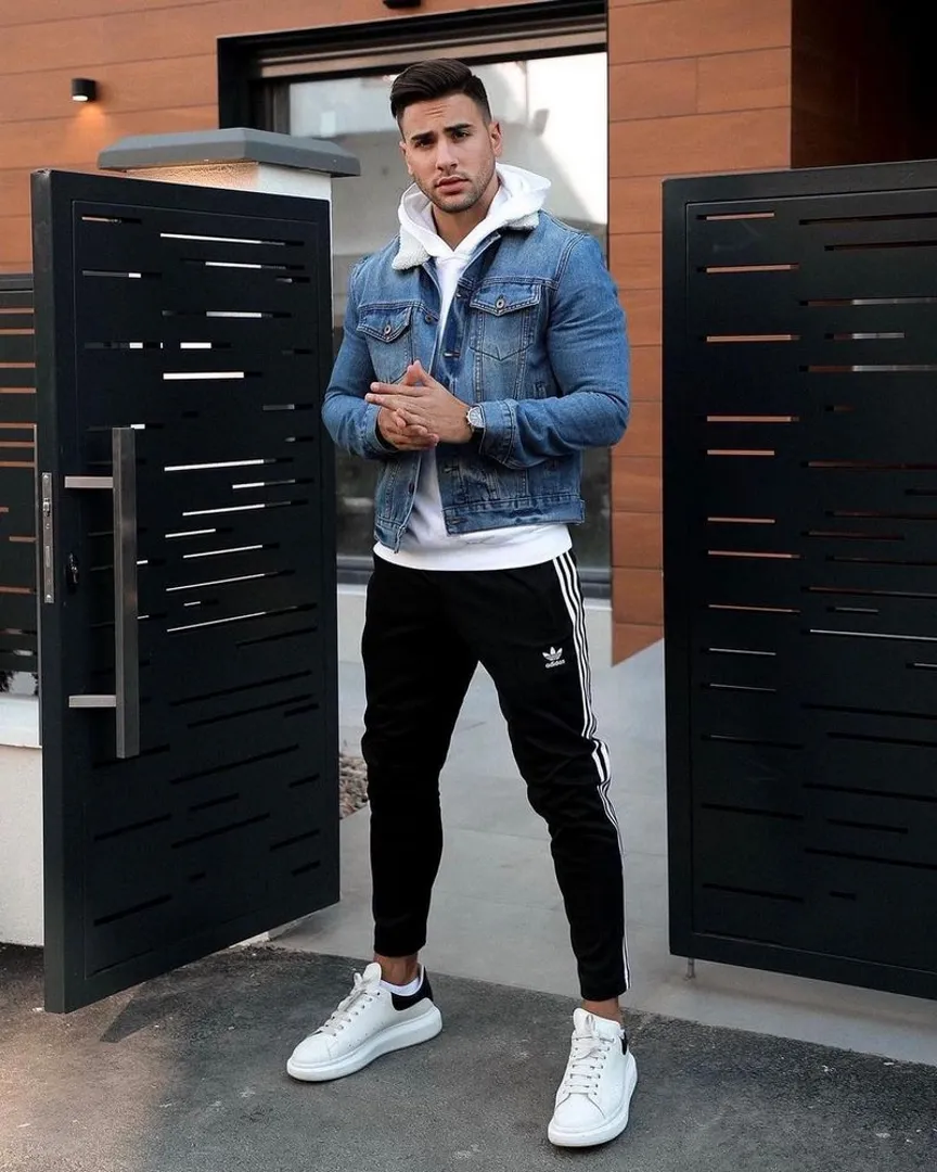 Для воплощения образа в формате «спорт и костюм» наденьте серую толстовку средней плотности в сочетании с угольно-серым костюмом и выберите белые кроссовки на шнуровке вместо обычной повседневной обуви.