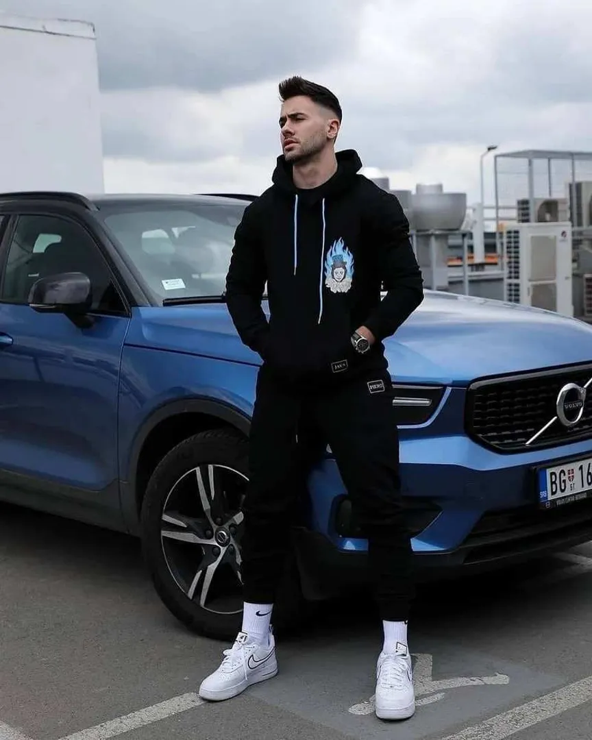 Чтобы полностью соответствовать требованиям спортивного стиля, сочетайте черную толстовку с черными приталенными джоггерами и наденьте пару минималистичных кожаных кроссовок. Готово.