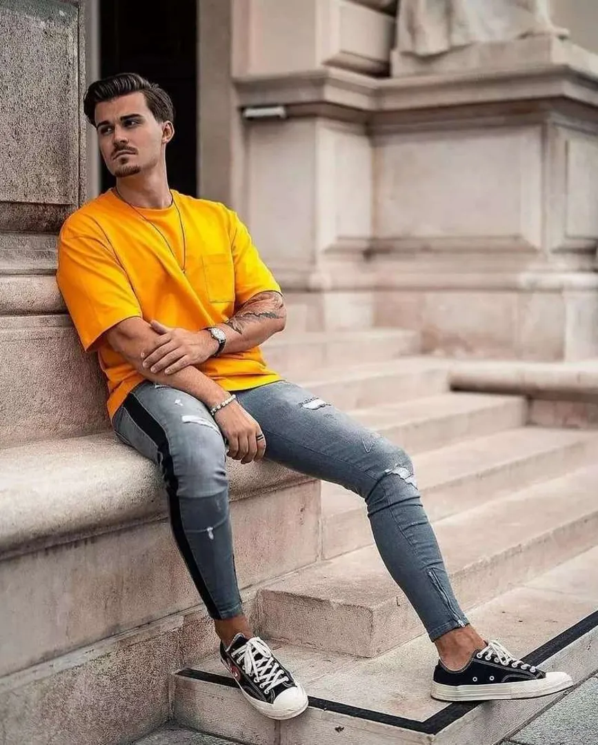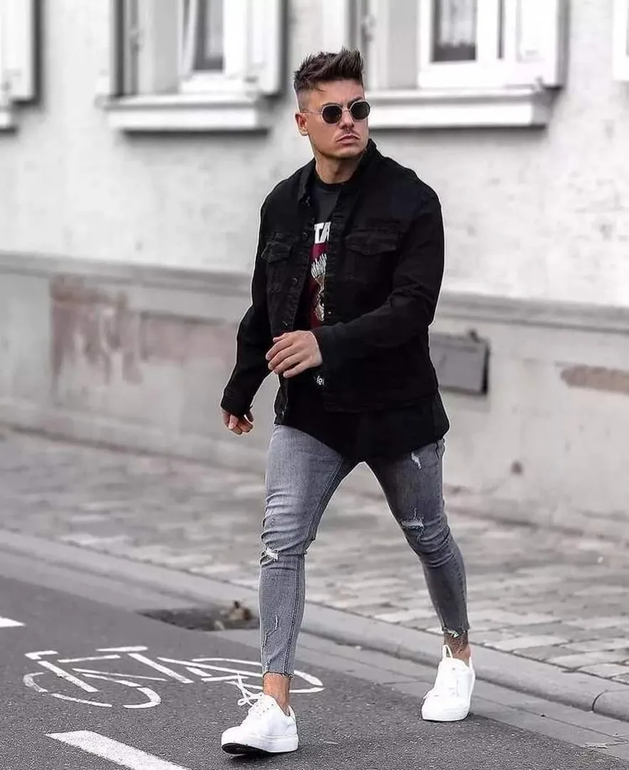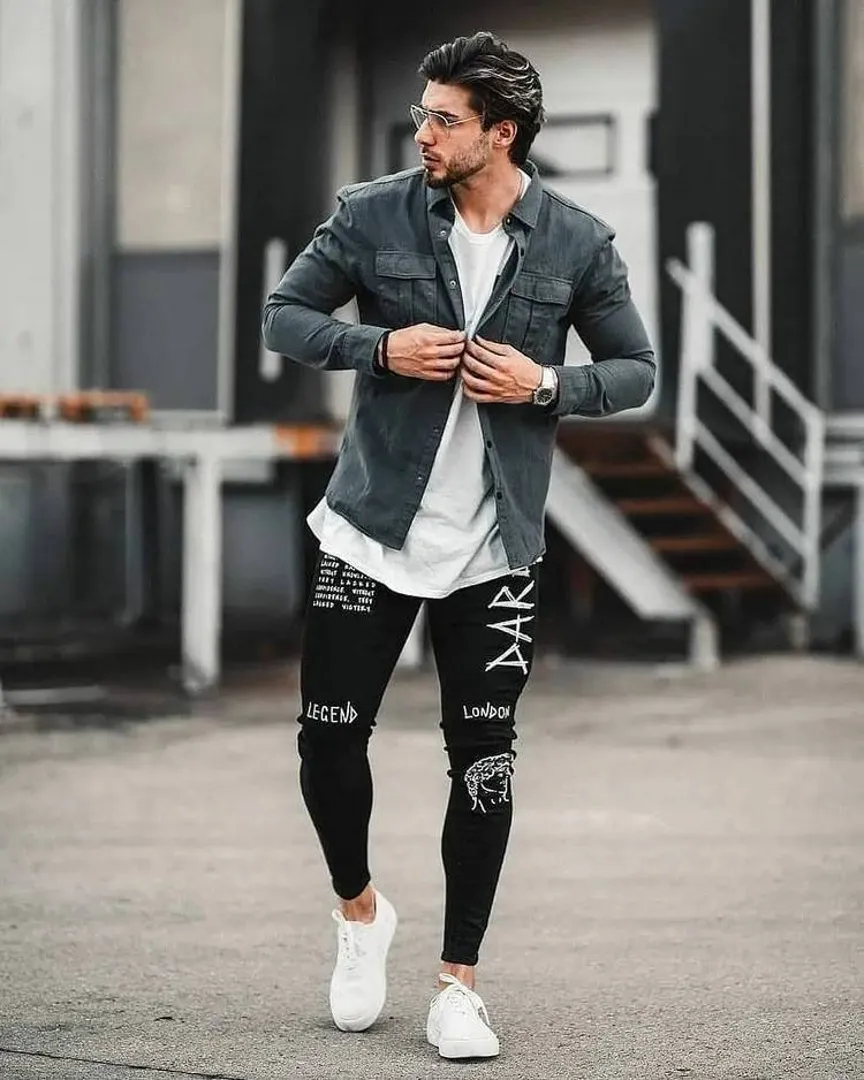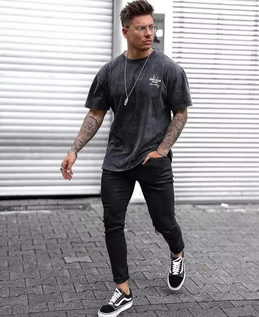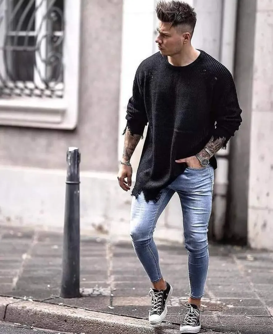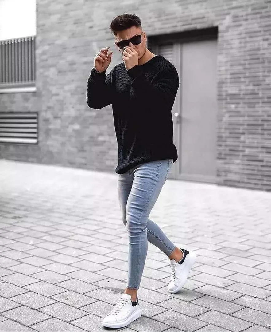 Составление аутфита – вопрос сугубо индивидуальный. На деле всё зависит от того, какая у вас фигура и приверженцем какого стиля вы являетесь. Если вы предпочитаете носить обтягивающие модели, то верх желательно уравновесить дополнительным объёмом. Для этого отлично подойдут свитера грубой вязки, всевозможные худи, просторные рубашки в крупную клетку, а также просторные базовые футболки белого или серого оттенка. Самая подходящая обувь к обтягивающим моделям – кеды, мокасины, лоферы и даже массивные ботинки.