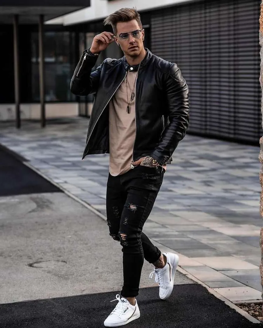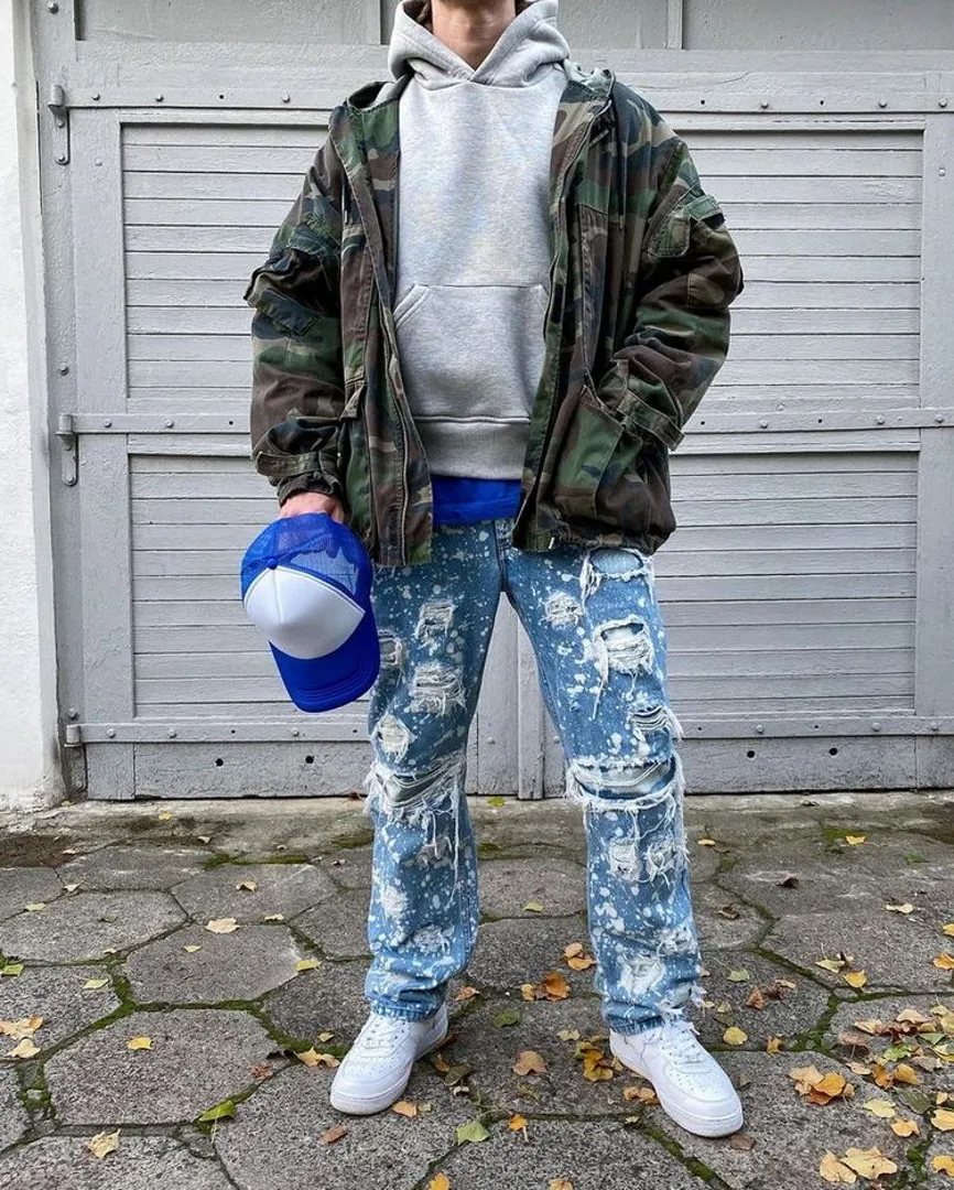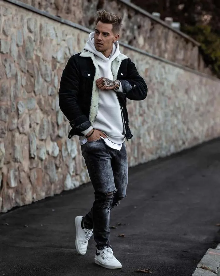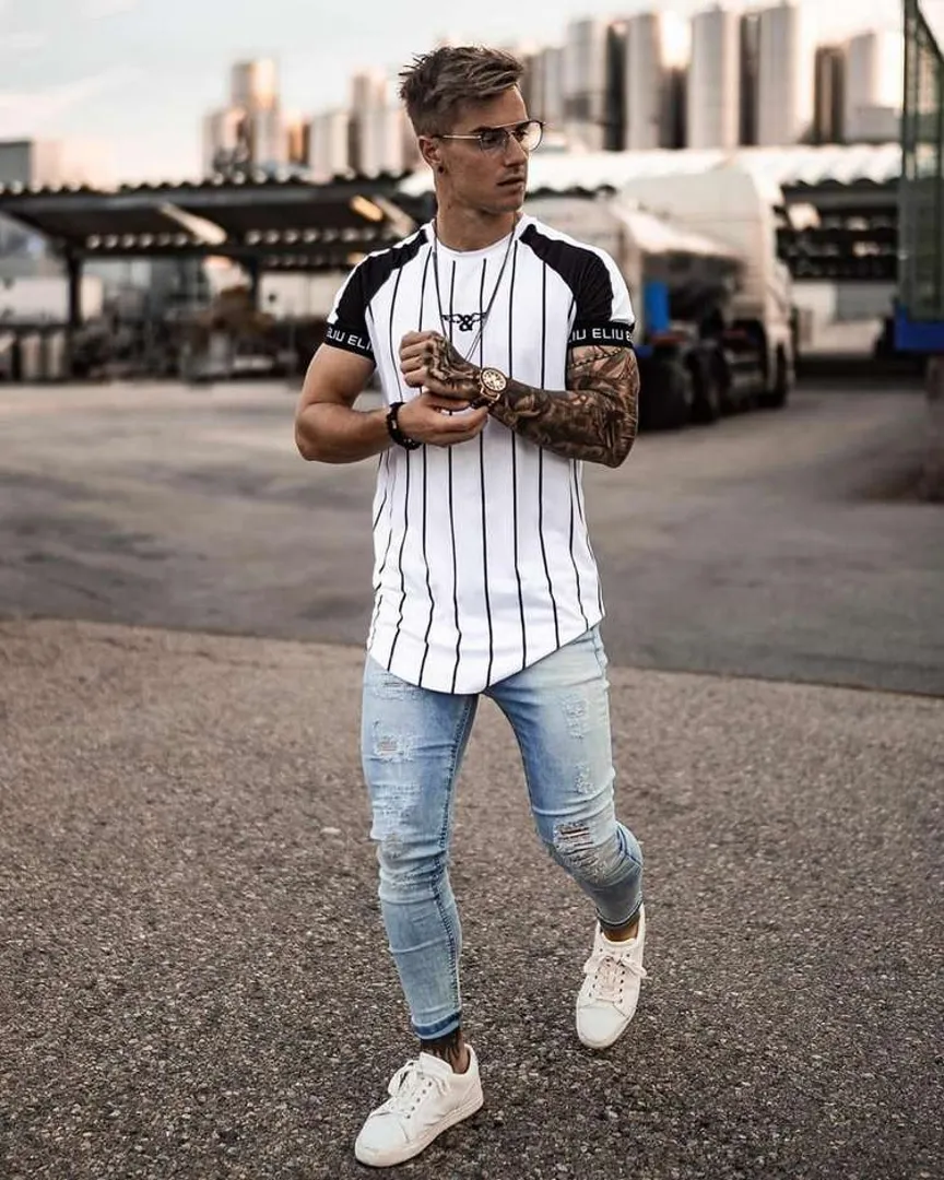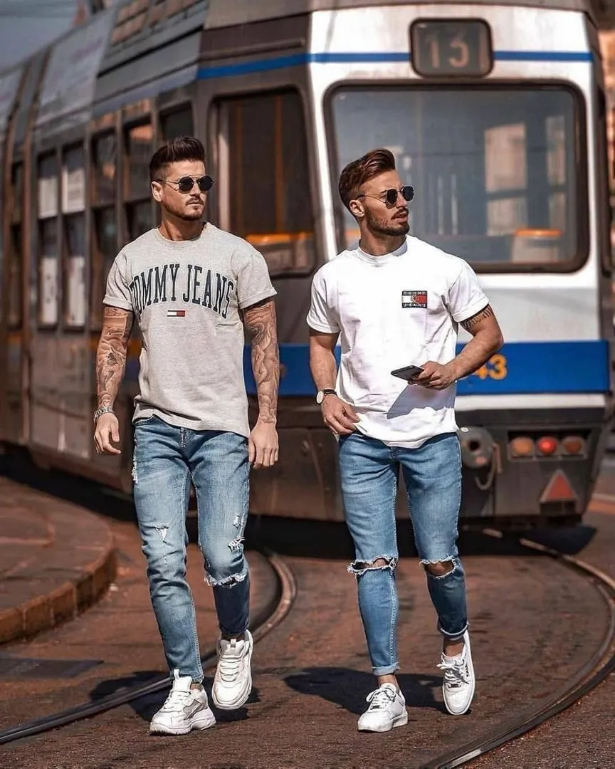 Составление аутфита – вопрос сугубо индивидуальный. На деле всё зависит от того, какая у вас фигура и приверженцем какого стиля вы являетесь. Если вы предпочитаете носить обтягивающие модели, то верх желательно уравновесить дополнительным объёмом. Для этого отлично подойдут свитера грубой вязки, всевозможные худи, просторные рубашки в крупную клетку, а также просторные базовые футболки белого или серого оттенка. Самая подходящая обувь к обтягивающим моделям – кеды, мокасины, лоферы и даже массивные ботинки.