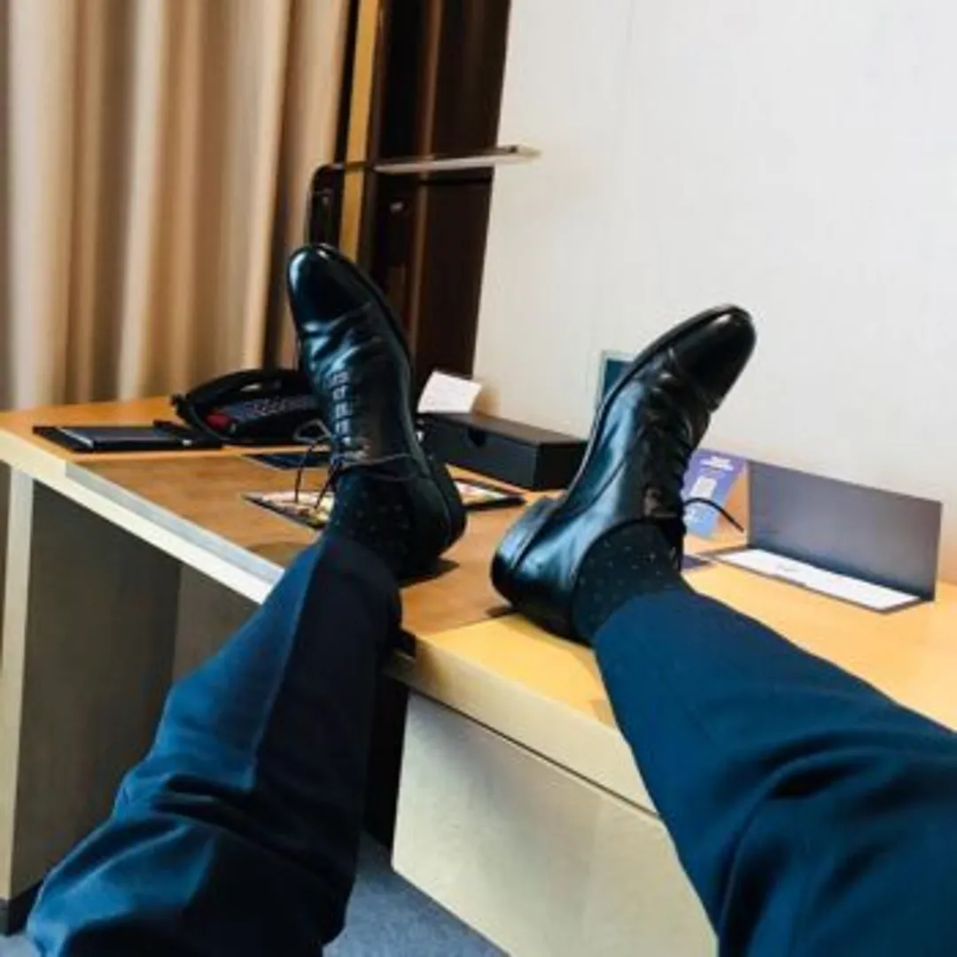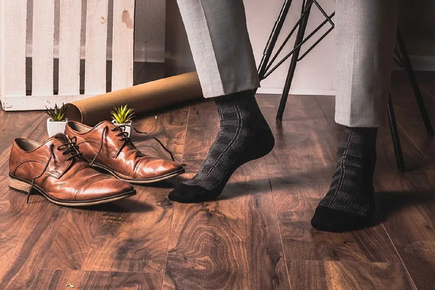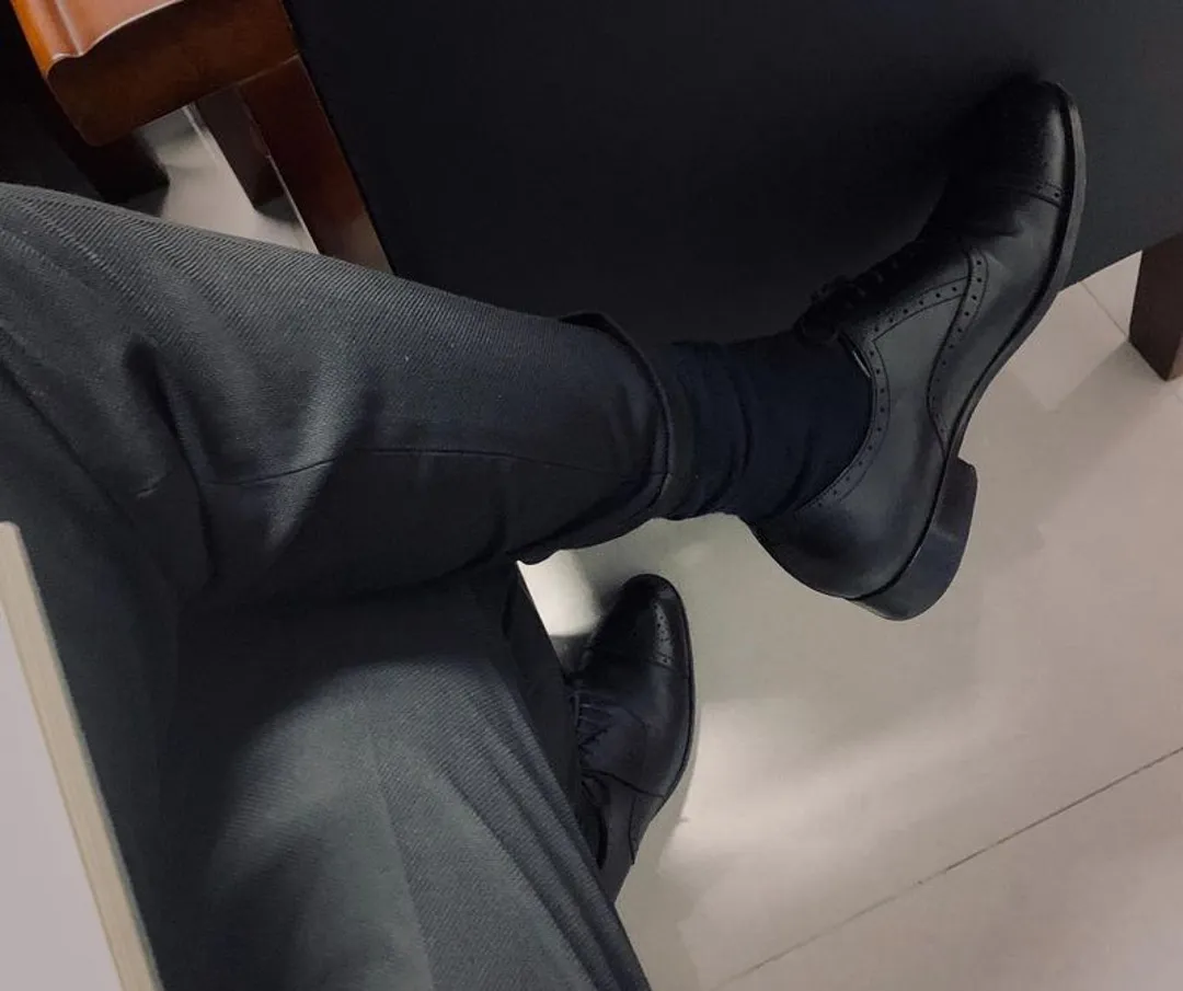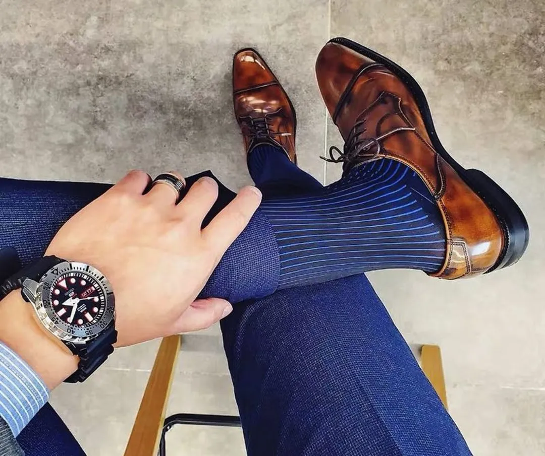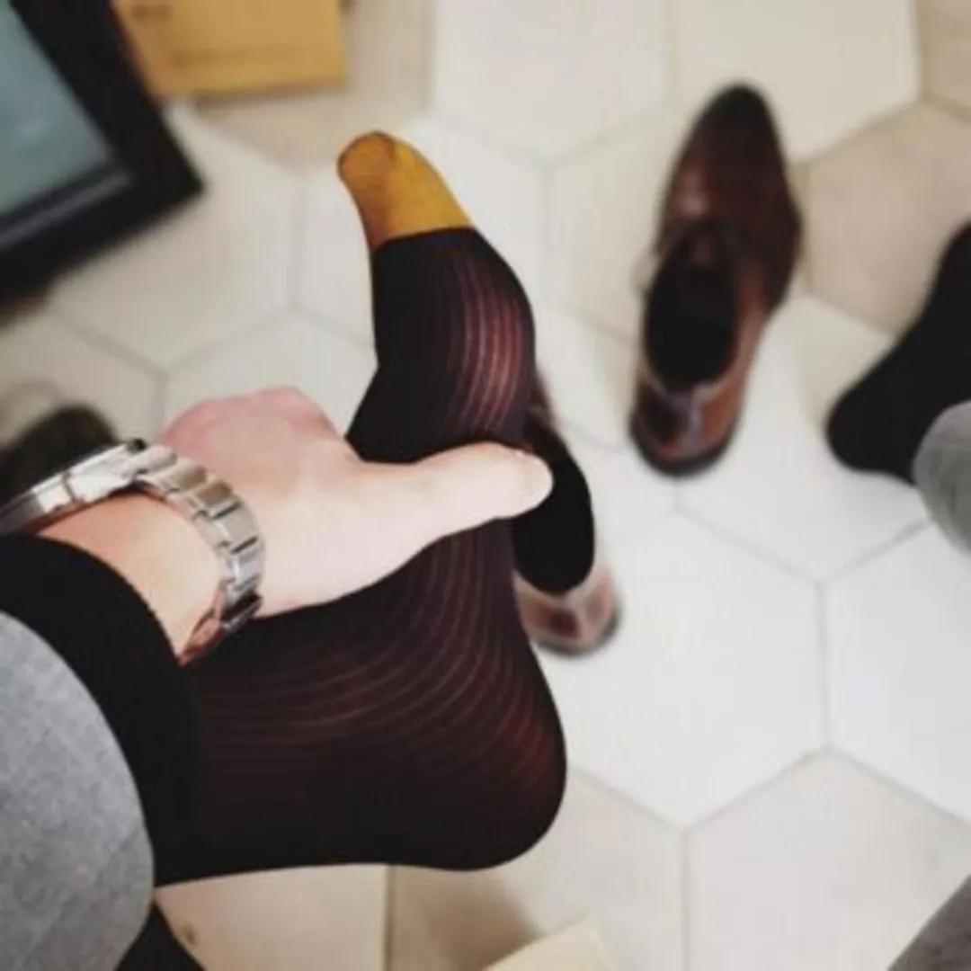 Когда вы сидите, закидываете ногу на ногу или даже когда ставите ноги на стол, сидя в своем кресле, ваши носки должны спрятать голень, как от посторонних, так и от вас самих. Голые мужские ноги не привлекут внимание как женские, поэтому не давайте повод коллегам, партнерам и начальству ими любоваться. Поверьте, ничего хорошего от этого не будет.