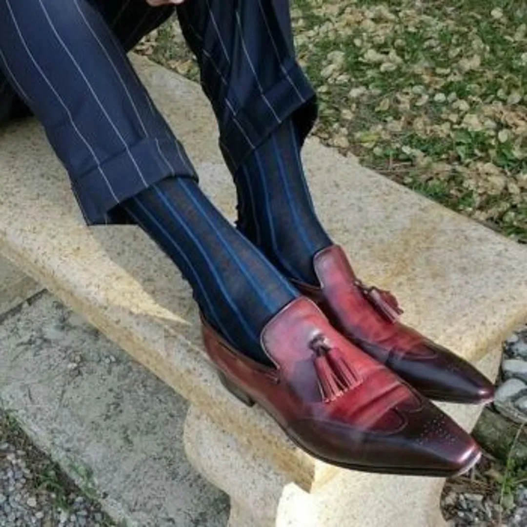 Частый вариант делового наряда – синий или голубой. Так как эти оттенки легко сочетаются с большинством цветотипов, к ним не сложно подобрать любые аксессуары, в частности и носки. Традиционный вариант для синего костюма – синие носки, ну или голубые, они тоже вполне допустимы. Если вы готовы пойти дальше, тогда к синему ансамблю подойдут оттенки красного и бордового. В идеале к комплекту можно добавить красный галстук. Такой трюк можно провернуть и с фиолетовым или зеленым вариантом.