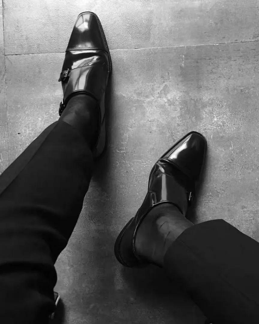 Сдержанный вариант сочетания: черный костюм, черные носки и черные туфли. Классика всегда актуальна.