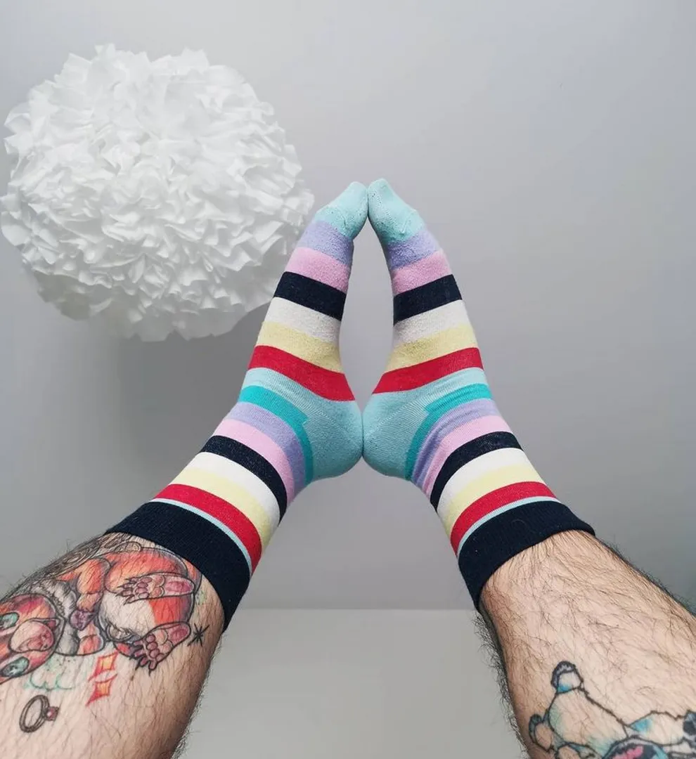 - Когда цвет носков подбирается под аксессуары и фурнитуру. Например, желтые носки под желтые шнурки на ботинках, фиолетовые носки под браслет. Тут тоже особых сложностей не возникнет.
