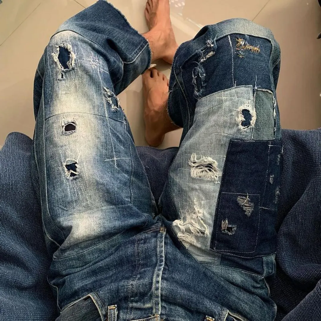 Джинсы с внутренней заплаткой – фантастический вариант для создания рокерского образа. Мужчины могут сочетать представленный вариант рваных и отремонтированных джинсов с джинсовой курткой и повседневной футболкой. Спортивная обувь и верхний крутой образ станут идеальным сочетанием. Идеи самостоятельной порчи сделают ваши рваные джинсы более интересными. Нарисованные надписи на царапинах джинсов добавят привлекательности.